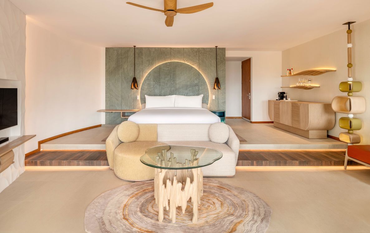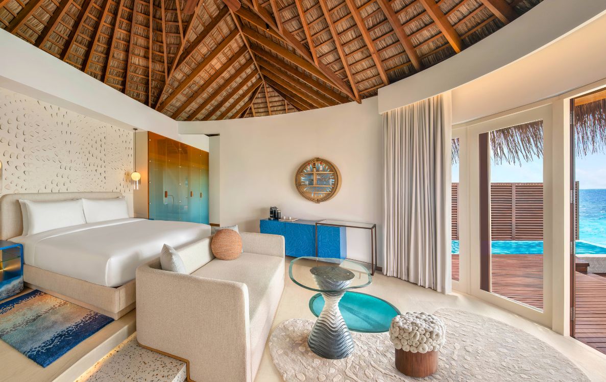 The experience begins the moment guests touch down by seaplane, greeted by the escape’s signature Arrival Jetty, where crystal-clear waters and a sleek, arched design set the tone for what’s to come. A hidden bar with uninterrupted views of the house reef offers an instant taste of island indulgence. From there, the brand’s signature Living Room welcomes guests into an open-air sanctuary, where soaring ceilings, bold colours, and natural textures frame endless ocean views.