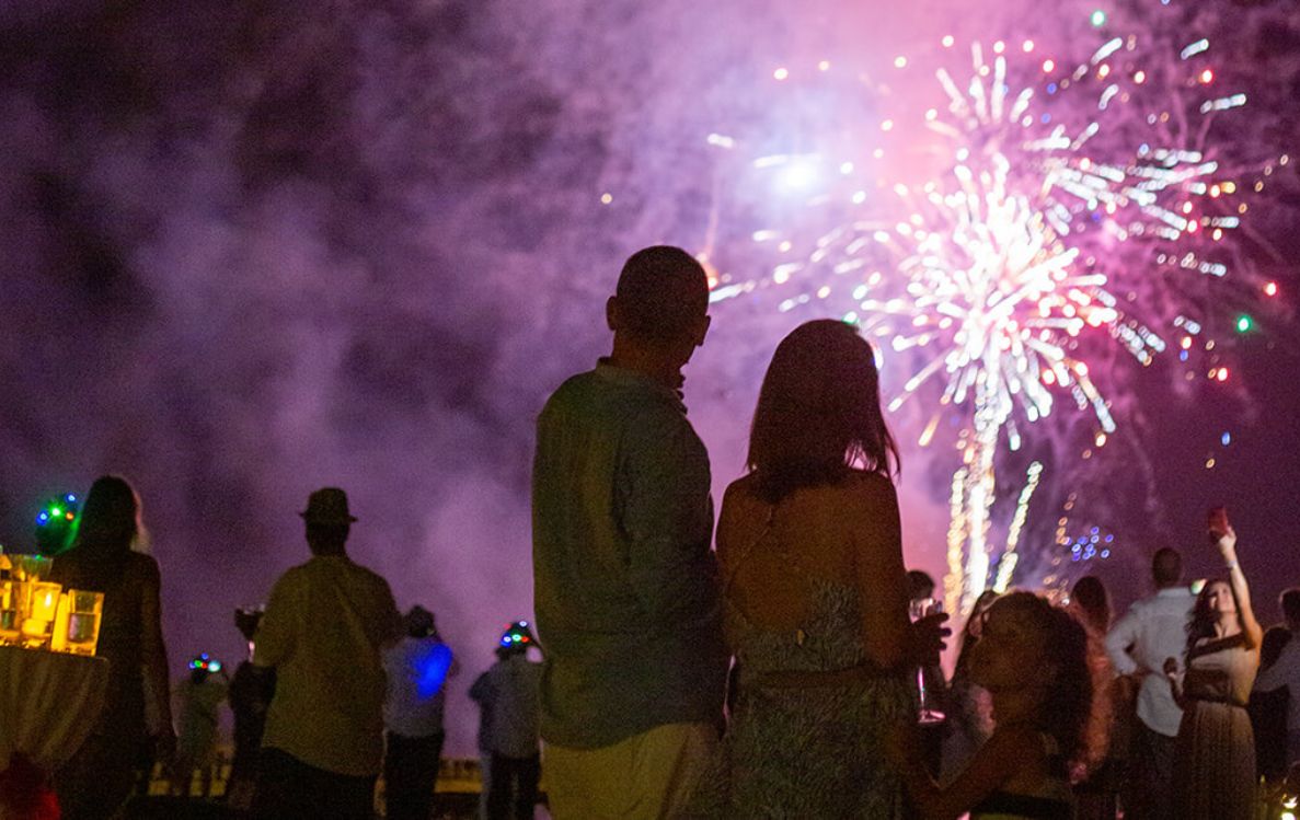 New Year’s Eve unfolds as a vibrant carnival of colour and energy. The celebrations begin earlier in the day with a playful Mask Party, setting the tone for an evening filled with laughter and anticipation. As sunset approaches, guests are welcomed to a lively cocktail gathering beneath the stars, where sparkling drinks and island rhythms flow.