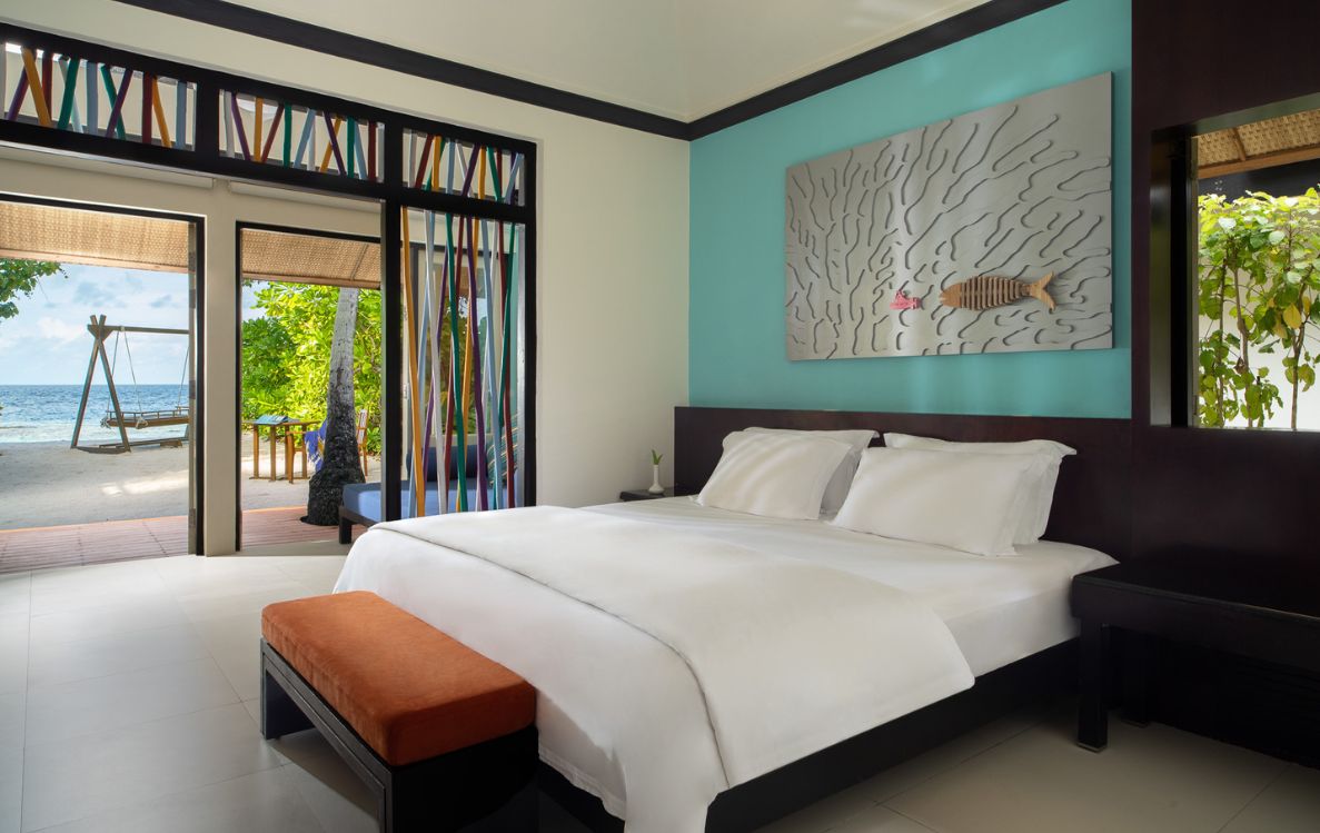 Inside, the design balances modern minimalism with bright, airy rooms furnished with sustainable materials and splashes of tropical color. Step outside, and you’re never more than a few paces from the lagoon.