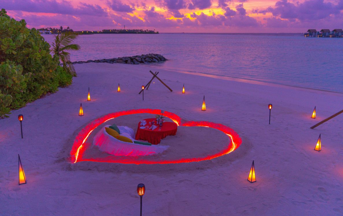 Across the lagoon, Hard Rock Hotel Maldives sets a different tempo with its Love Loud, Live Proud Valentine’s programme. Dance-led fitness sessions, couple-focused pool games, and sunset partner yoga lead into beachfront dining, live music, and Latin-inspired performances under the stars.