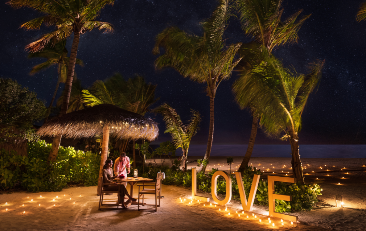 Guests can indulge in a floating breakfast, served in their own villa pool, or opt for a sun-kissed sandbank picnic. As the sun sets, romantics can immerse themselves in the magic of the Dine by Design collection, which allows them to create a perfect bespoke evening from a variety of beautifully decorated setups. The Starlit Dinner menu features charmingly named courses such as Love is in the Air, a citrus poached lobster with potato terrine, fennel chiffonade and caviar beurre blanc, and Life is Sweet; Make It Sweeter, a rose-flavored pistachio sponge soaked in custard.