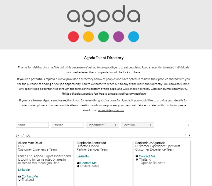 “We built this because we’ve had to say goodbye to great people at Agoda recently; talented individuals who we believe other companies would be lucky to have,” a statement on the Agoda Talent Directory site said.