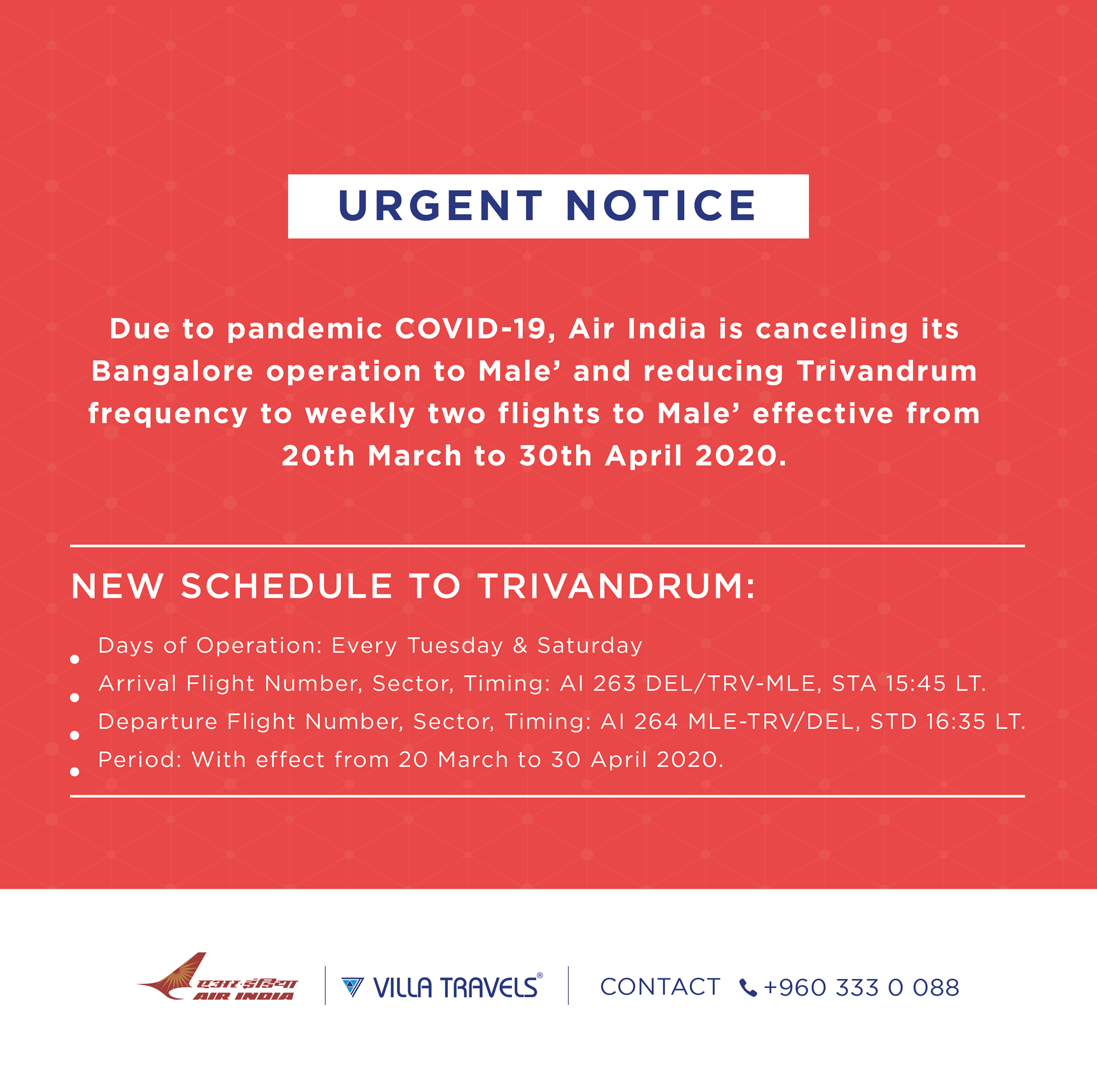 Due to the COVID-19 pandemic, Air India has canceled its Bangalore operation to Male’ and reduced Trivandrum frequency to weekly 2 flights to Male’.