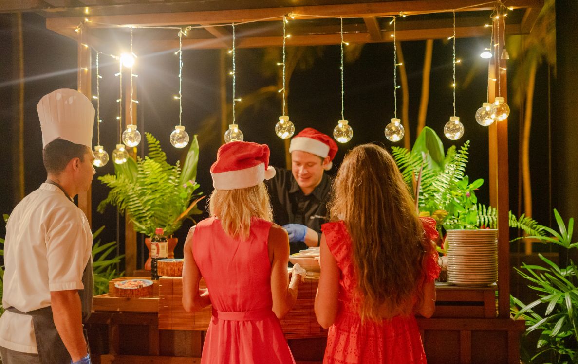 Immerse in a journey of relaxation and merriment that begins with a Christmas Tree Lighting Ceremony and cocktail party with carolers on the beach, enveloping the island in a warm holiday atmosphere. On Christmas Eve, dive into a Lagoon Treasure Hunt, snorkeling through serene, crystal-clear waters. Then wake up to a magical Christmas Day that unfolds with the arrival of Santa, a festive tavolata-style lunch, and a special Christmas dinner, before winding down with a cozy family movie night under the stars.