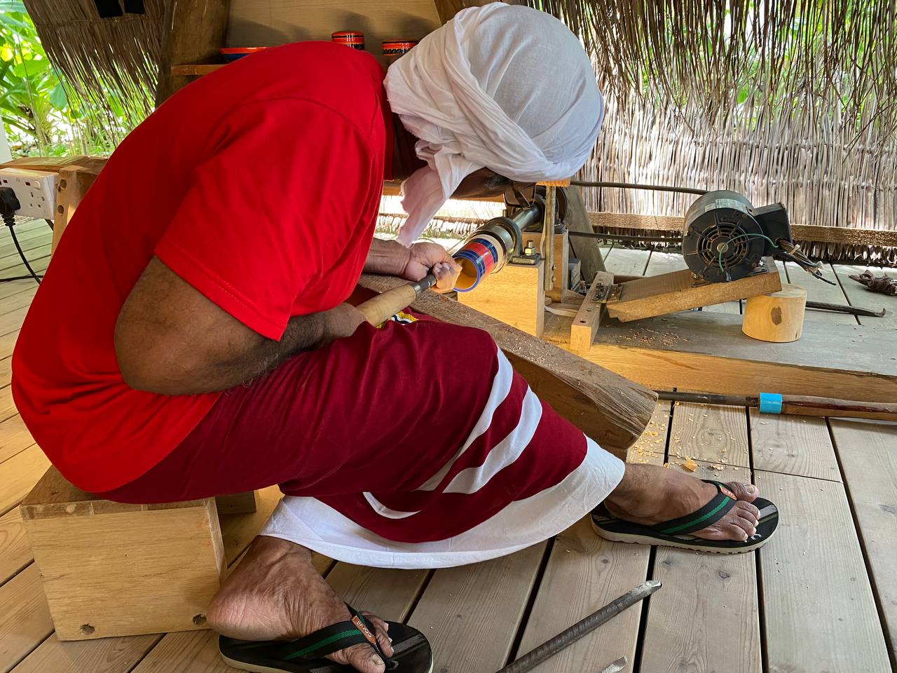 For the festivities, the resort built an island village with a traditional thatched hut displaying historical elements of the country along with local tools and lacquer work. Ibrahim Solih from Baa Thulhadoo, is a special highlight in this series. Ibrahim, a third generation craftsman, famous in the atoll for his meticulous wooden lacquer work, is following his family business like his father.