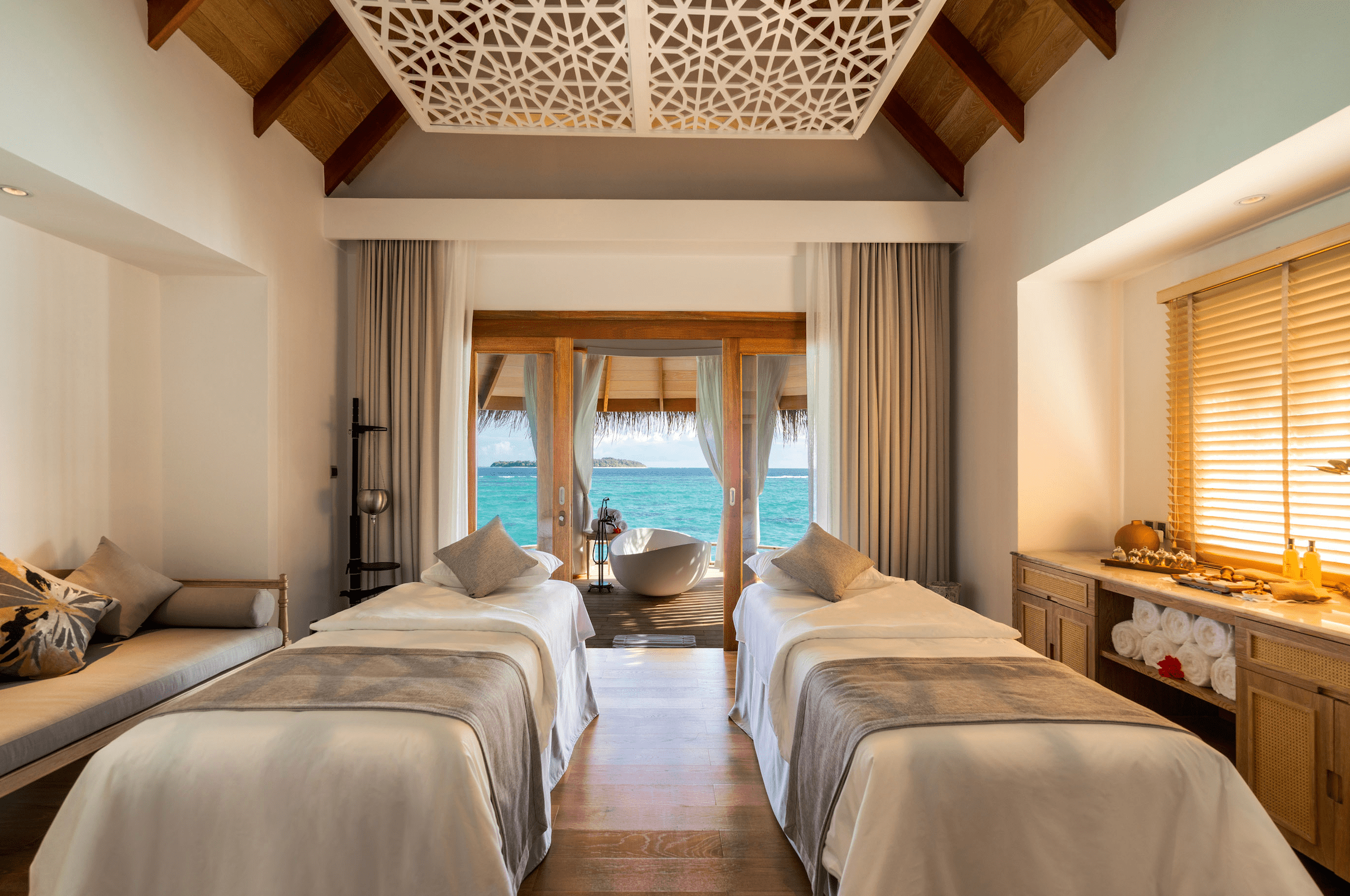 The Spa team invites guests to join special workshops and wellness sessions created to re-energise. Serenity Spa will also host a range of morning and Aqua Yoga experiences. In addition to the sessions and treatments, Serenity Spa has prepared a unique workshop where guests are taught to relieve stress and pain using Maldivian herbs and local techniques.