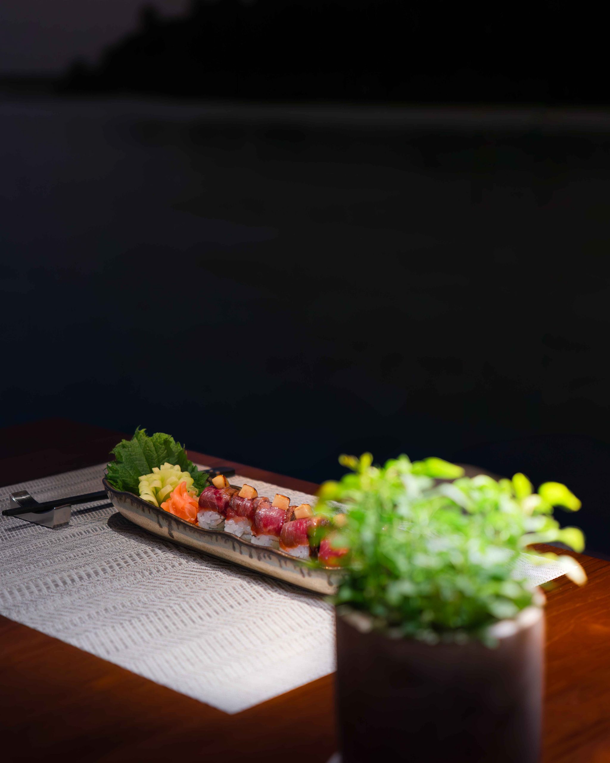 One new feature is an extended overwater structure, which is seamlessly connected to the original restaurant. Featuring a raised ceiling under a thatched roof, the structure is complemented by a dramatic chandelier and showcases an expansive sushi counter along with additional seating for another 20 guests. The expanded seating capacity ensures that more guests can savour the restaurant’s culinary delights while taking in the breathtaking panoramic views of the Indian Ocean.