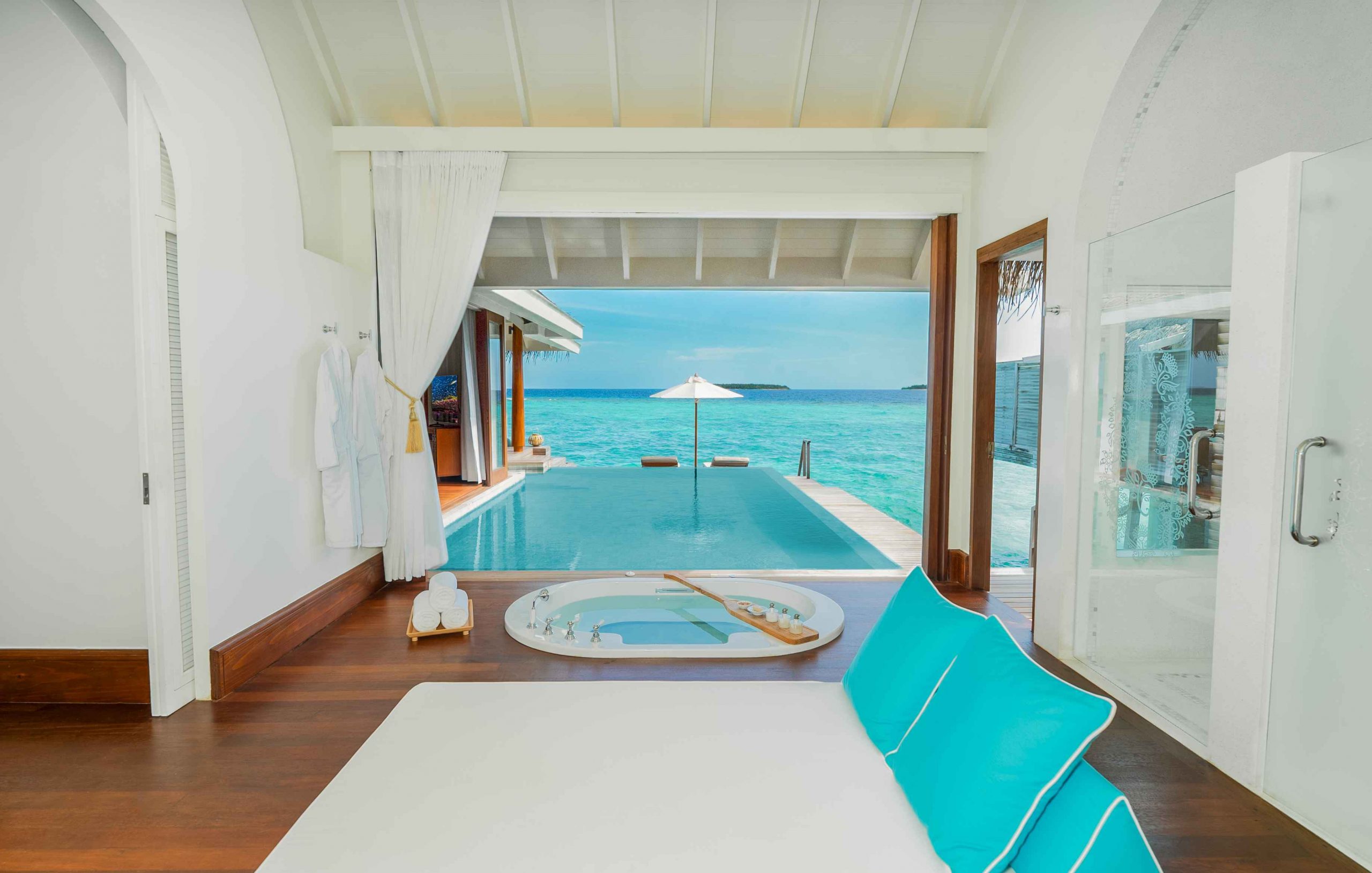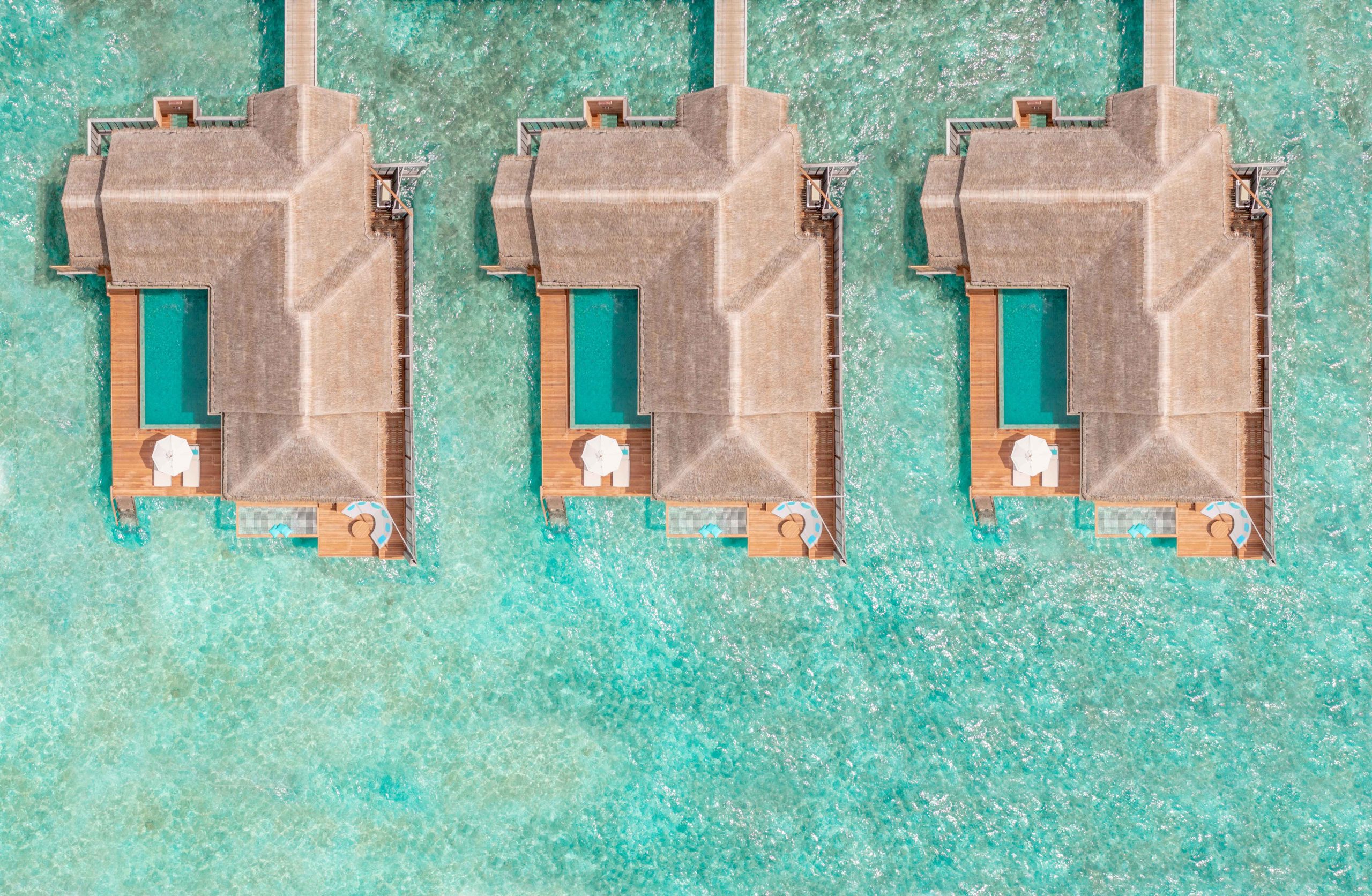 With a focus on comfort and convenience, the 267sqm hideaways still feature king size beds and a walk-in dressing room, but the overall interiors have been given an airier vibe with the use of lighter coloured wood. Floor to ceiling sliding glass doors also let the outside in, allowing guests to awaken each day to the blissful experience of ocean views stretching off to the horizon. When it comes to breathtaking views, it’s hard to beat the mesmerising experience of watching fish swim beneath you as you bathe in a glass-bottomed soaking bathtub.