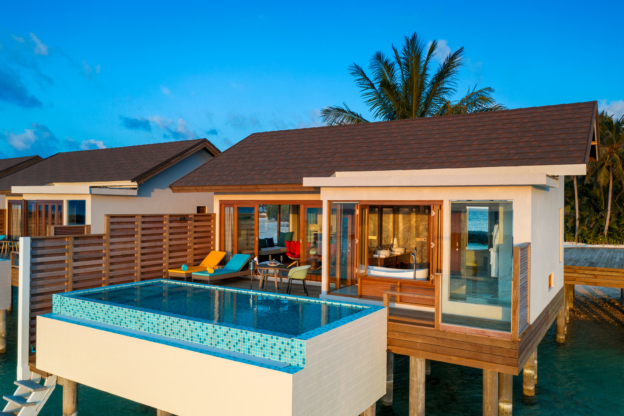 There are two overwater villa options available to guests; 12 facing the main island for the best sunrise views, and 28 sunset view villas with private pool.