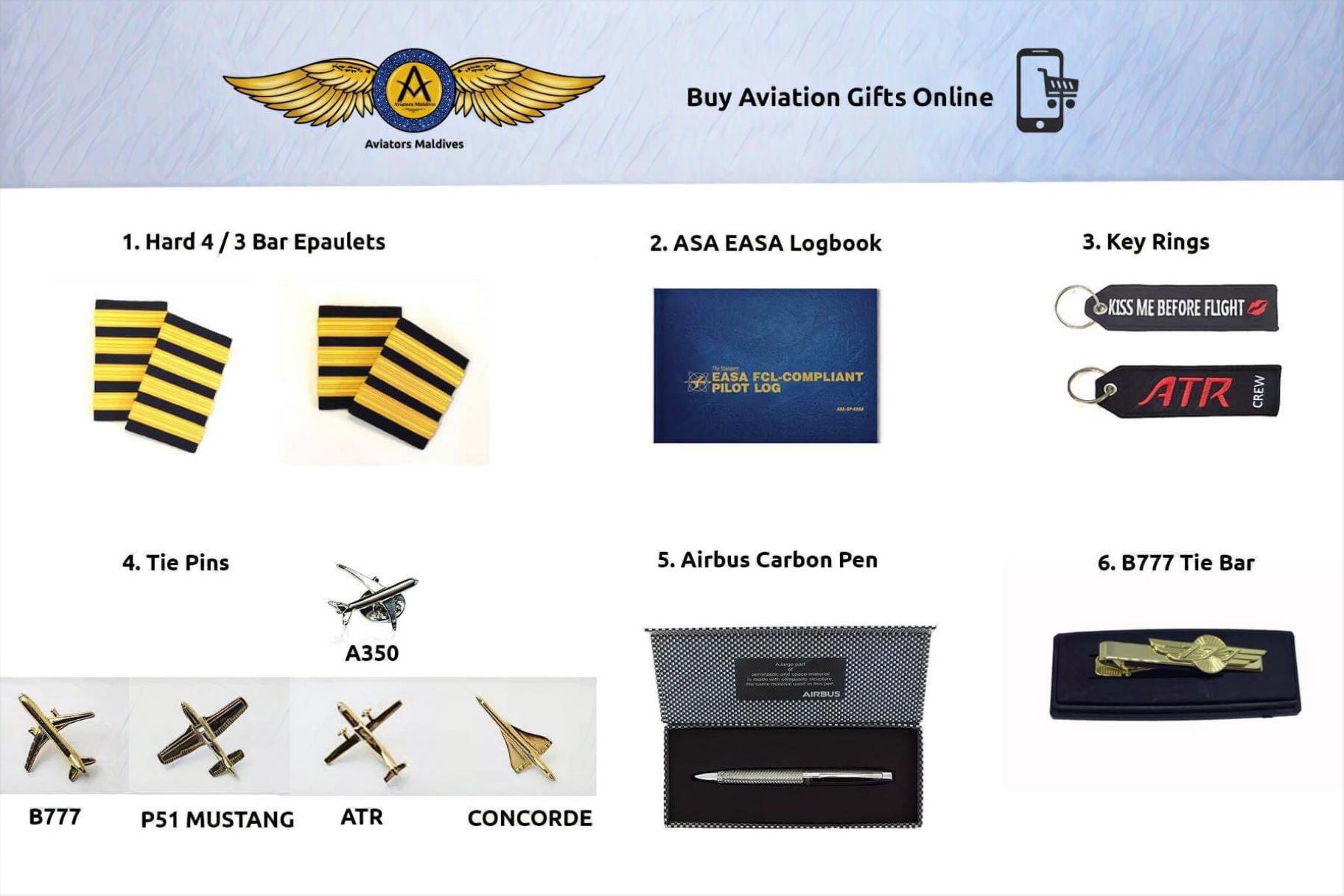 Products available right now include epaulets, ASA EASA logbooks, keyrings, B777 tie bars, and Airbus carbon pens. They also have tie pins that come in models A350, B777, P51 Mustang, ATR, and Concorde.