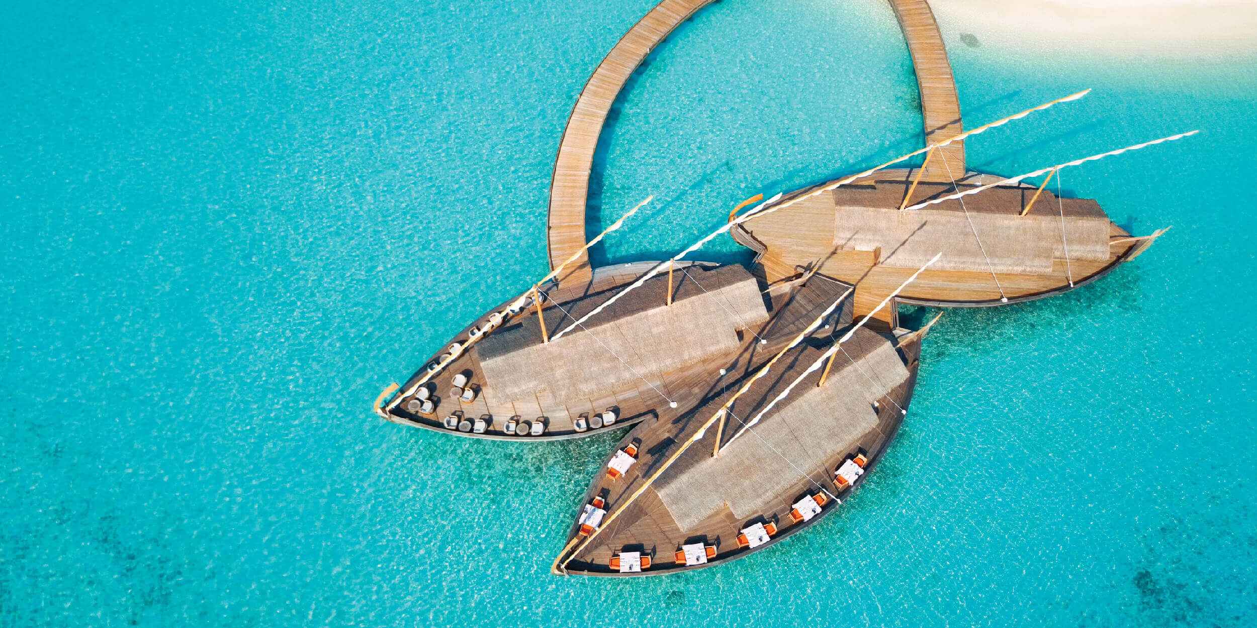 Upon arriving at Milaidhoo, guests are greeted by the enchanting sight of three wooden boats floating on the azure lagoon. The first boat serves as a sunset bar, offering island-inspired libations infused with local ingredients. The second boat houses the kitchen where culinary magic unfolds, while the third boat transforms into the restaurant. Here, under the starlit sky and billowing sails, diners savor delectable dishes. For an unforgettable experience, guests can choose to dine on the deck beneath the celestial night sky.