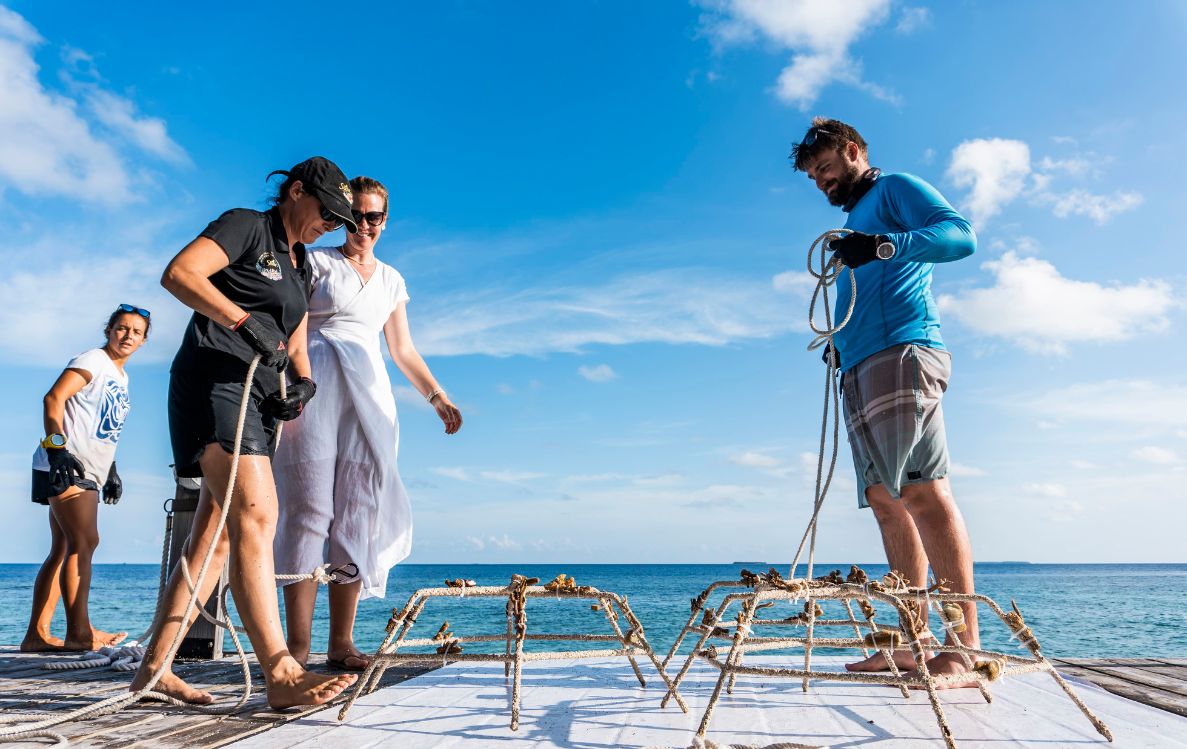 Determined to counter this trajectory on their doorstep, the Big Build Maldives 2024 is a testament to resilience and hope in a time where action is needed. The project brought together restoration experts and marine biologists, engineers, resort staff, locals, guests, and the leadership of Planhotel Hospitality Group. Following months of planning and preparation, manufacturing and coating of reef stars and navigating the challenges of remote island logistics, the dedicated team was ready for the ‘Big Build’. The restaurant deck transformed into a bustling workshop where volunteers attached coral fragments to reef stars under the guidance of Mars’ experts. On the final day, the presence of Planhotel’s president, Ms. Sara Rosso, and the Managing Director of Voyages Maldives and Seagull Group, Mr. Salah Shihab, highlighted the project’s importance and unified spirit.