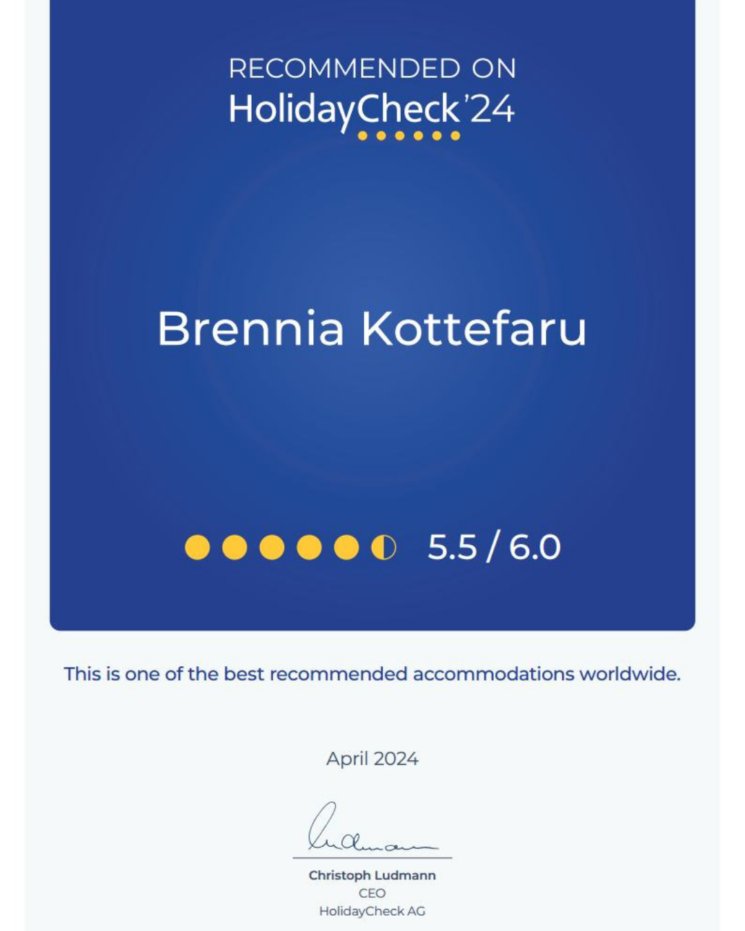 Brennia Kottefaru Resort has been honoured with a prestigious award from HolidayCheck, a leading travel platform in Germany. The resort believes this recognition reflects its ongoing commitment to providing exceptional service, as well as the dedication and hard work of its entire team in creating unforgettable memories for its valued guests.