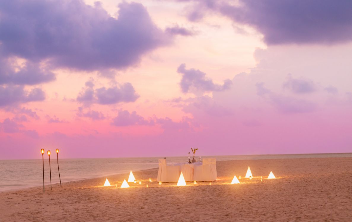 For a dining experience as magical as the setting itself, the Veli Dinner offers a five-course gourmet menu paired with fine wine, served on the resort’s iconic sandbank. Comfortable in a soft sand arrangement, under the starry Maldivian sky, couples are treated to an unforgettable evening where every bite feels like part of a love story.