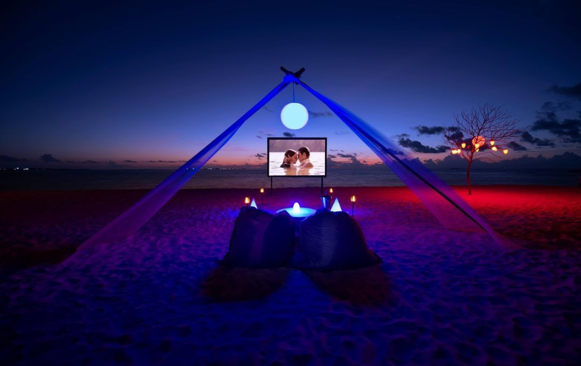 One of the highlights at Coco Palm Dhuni Kolhu is the weekly cinema night on the beach, where guests can enjoy classic films and new releases on a big screen in a comfortable setting. For a truly romantic experience, couples can opt for a private beach cinema with popcorn, drinks, and cosy beach-bag chairs. This intimate setup allows for a magical evening under the Maldivian sky.