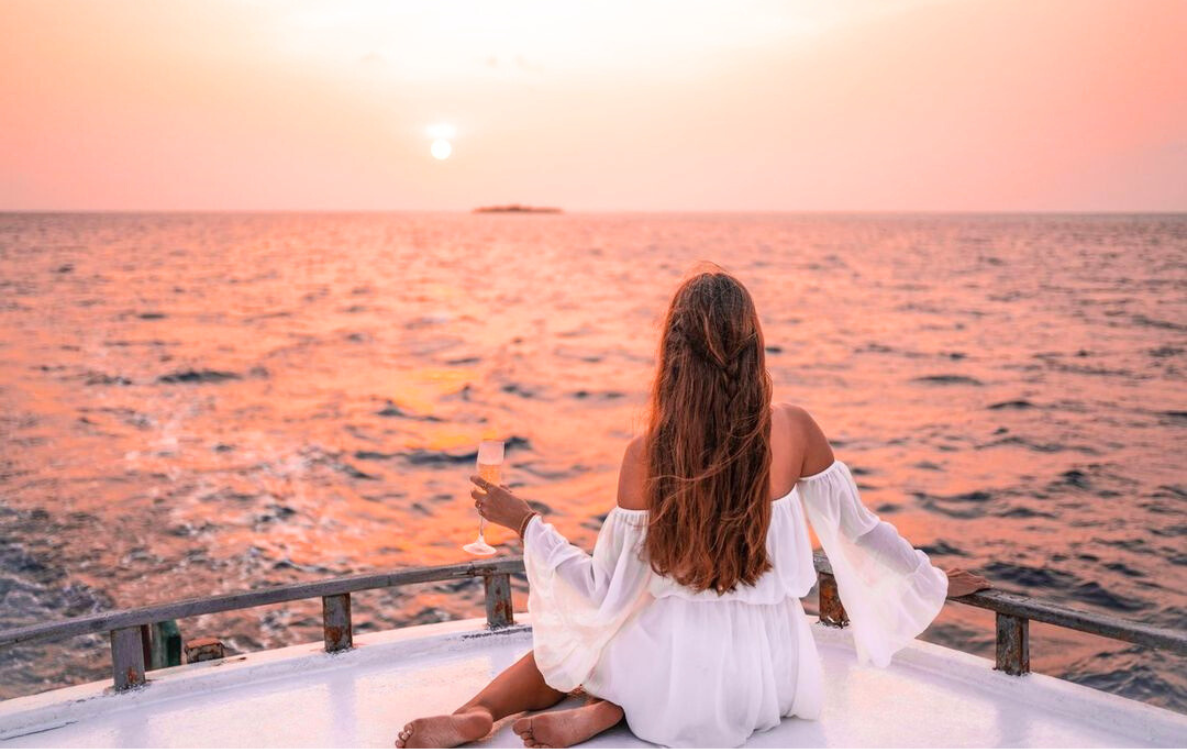 Embark on a sunset cruise aboard a hand-crafted Dhoni, gliding through the gentle waters as the sun dips below the horizon. The iconic black bow of the boat sets the stage for a dreamy pre-dinner date, enhanced by Champagne and canapés. Guests can join group cruises on select days or request a private experience for an added touch of luxury.
