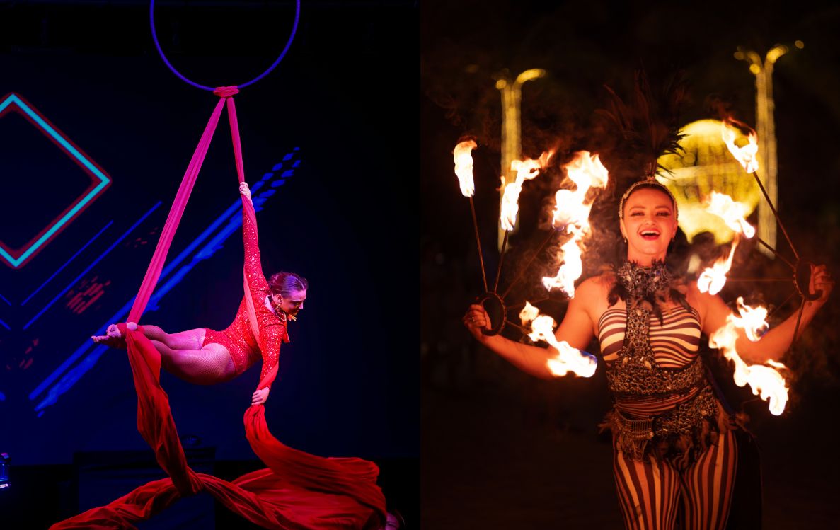 The main stage, set over the pool, became the heart of the night bringing together an international line up of performers. World rhythms flowed through the evening with DJ Elaiva, layered with vibrant saxophone interludes by Sharif and live sets from Australia’s Hamilton Band. Visual theatre unfolded around the stage as acrobats, aerialists and fire-led performances by Fiesta Creations brought movement and light, while cultural dance moments gently invited guests to join in. Throughout the night, Sid, the emcee, guided the celebration with warmth and an easy charm.