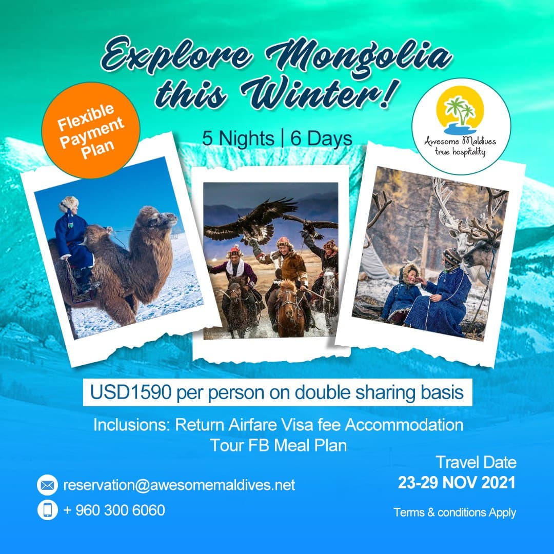 Additionally, a special package for Maldivians from 23 – 29 November 2021 was announced. For USD 1,590 per person on a double sharing basis for 5 nights, 6 days, you can explore Mongolia this winter. This package also includes return airfare, visa fee, and accommodation on a full board basis. All Maldivians are welcome to travel throughout the charter flights as well.