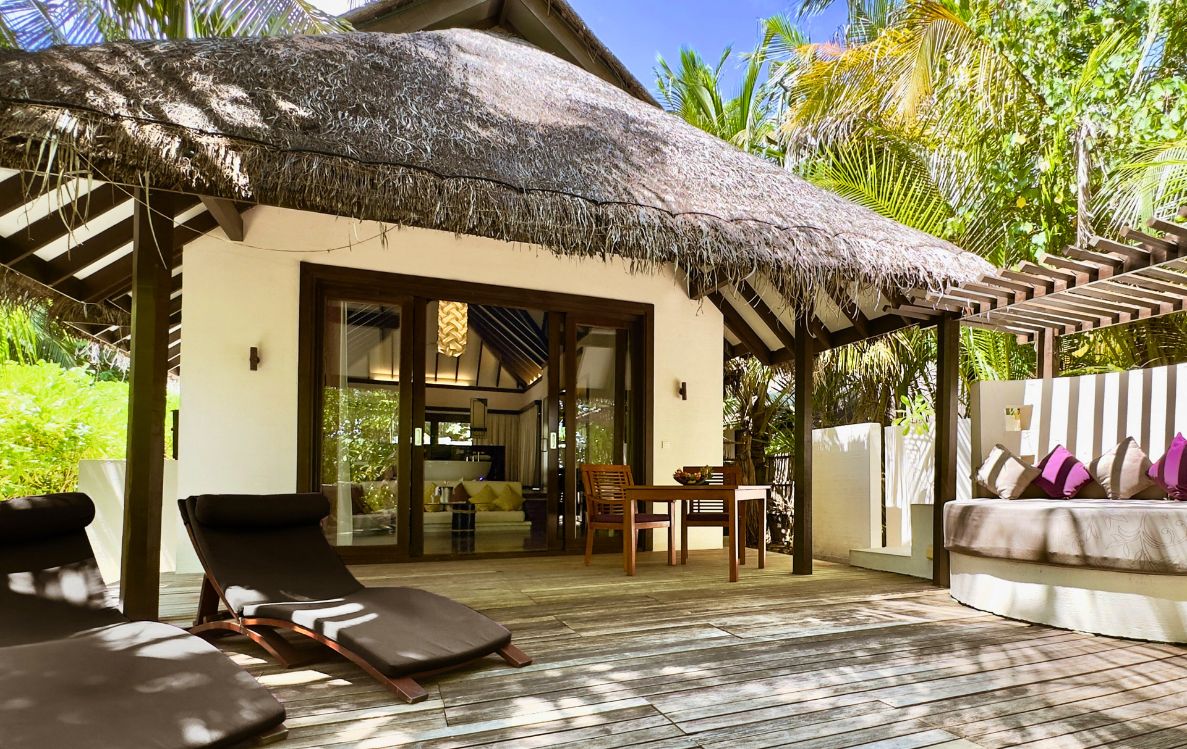 The resort, admired for its charm and natural beauty, is designed to offer an ideal balance of privacy and comfort surrounded by lush tropical greenery. This secluded beachfront escape with additional spacious villas features a sunken living area and an inviting king-sized bed, ensuring pleasant relaxation and an idyllic holiday in the Maldives.