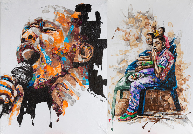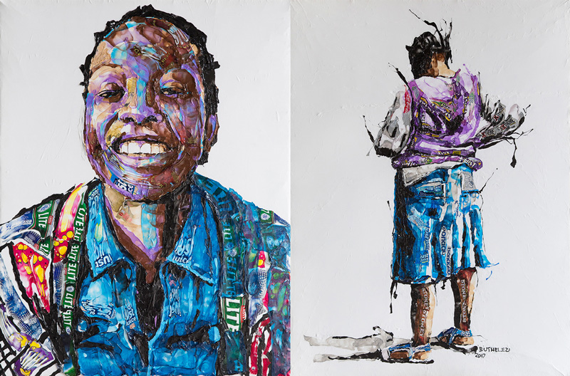 He scavenges for art supplies on the streets of Johannesburg on the way to his studio and meticulously lays strips of discarded plastic onto a canvas. This is followed by a blast from the heat gun to sculpt the plastic into gritty portraits full of texture depicting the beauty, diversity, and reality of life. Having developed this method 20 years ago, Mbongeni has since made a name for himself as one of South Africa’s most original artists having his work featured across the globe.