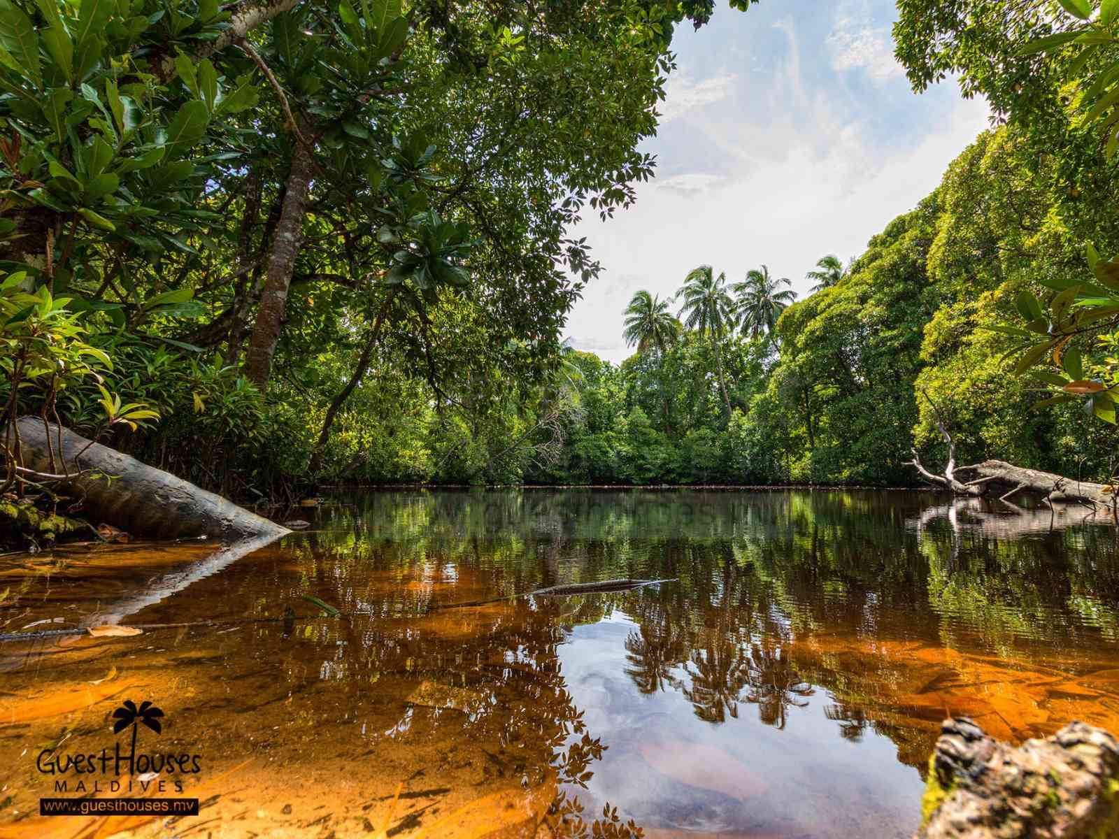 Imagine a densely vegetated area of the woods with ancient and huge trees towering over a rough pathway that leads to a small clearing. In the middle of the clearing is a small pond, reflecting the sky above on its placid mirror-like surface. This is the Fairy Pond of Laamu. One of the most peculiar aspects of the pond is that the waters tend to take on a reddish hue near the shallow edge, and fade into a murky dark green as the waters gradually deepen. This could be a reason why the pond has also earned another more sinister sounding appellation in recent years: Hell-mouth or Hell Hole.