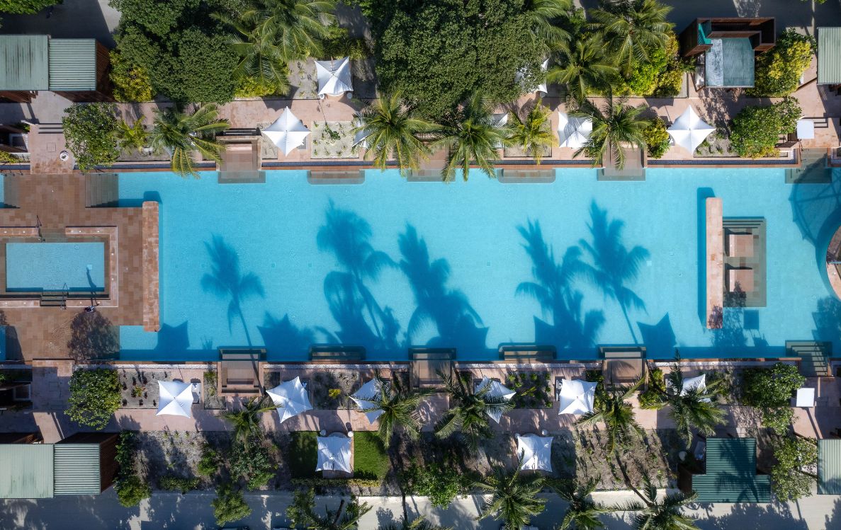 If serenity is what you seek, the resort’s 150-metre swimming pool—the largest in the Maldives—is a showstopper. Winding through palm-fringed gardens and dotted with shaded cabanas and jacuzzis, it invites you to slow down and soak up the sun. It’s more than a pool; it’s a centrepiece of calm where time melts away.