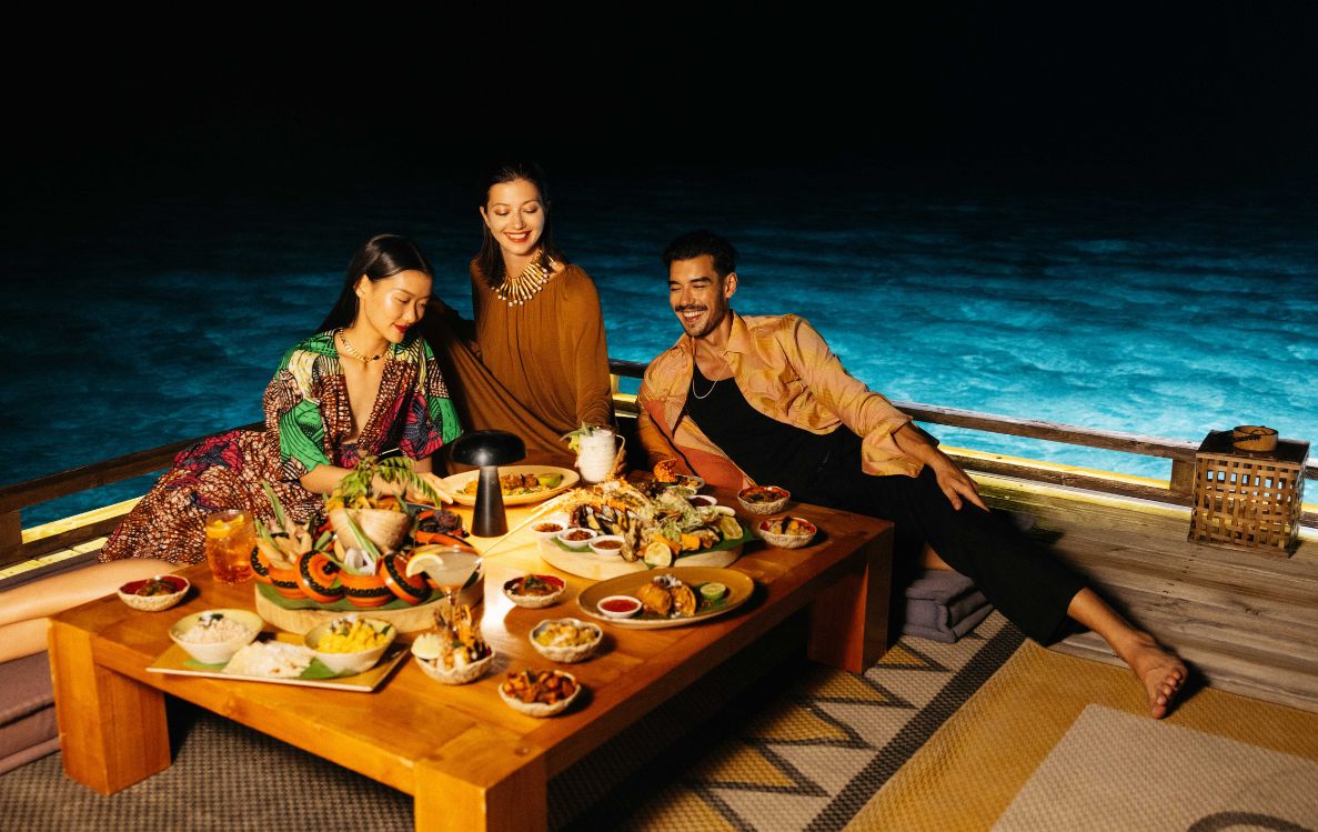Evenings in the Maldives are often alive with colour, music, and performance, especially at resorts like Seaside Finolhu in Baa Atoll, where evenings unfold like a theatrical performance. With a rotating line-up of acrobats, stilt walkers, and even “mermaid” performers, while its weekly sandbank party delivers a full-blown spectacle of music, dinner, and dance beneath the stars. Others, like Kandima Maldives, bring a modern twist with glow-in-the-dark beach parties and holographic light shows set a high-energy tone, with everything from live bands to themed pool parties keeping the atmosphere dynamic. Over at SO/ Maldives, the Pavilion Bar sets the mood for sundown with Mediterraneantwisted Levantine cocktails and champagne served from a stylish tableside cart, perfect for toasting as the sun dips below the horizon. Meanwhile, The Standard Maldives presents Guduguda, where casual, cushioned dinners on the floor meet authentic seafoodrich curries and coconutmilk delights served indoors or on a patio over the water, conversational, relaxed, and deeply rooted in Maldivian hospitality.