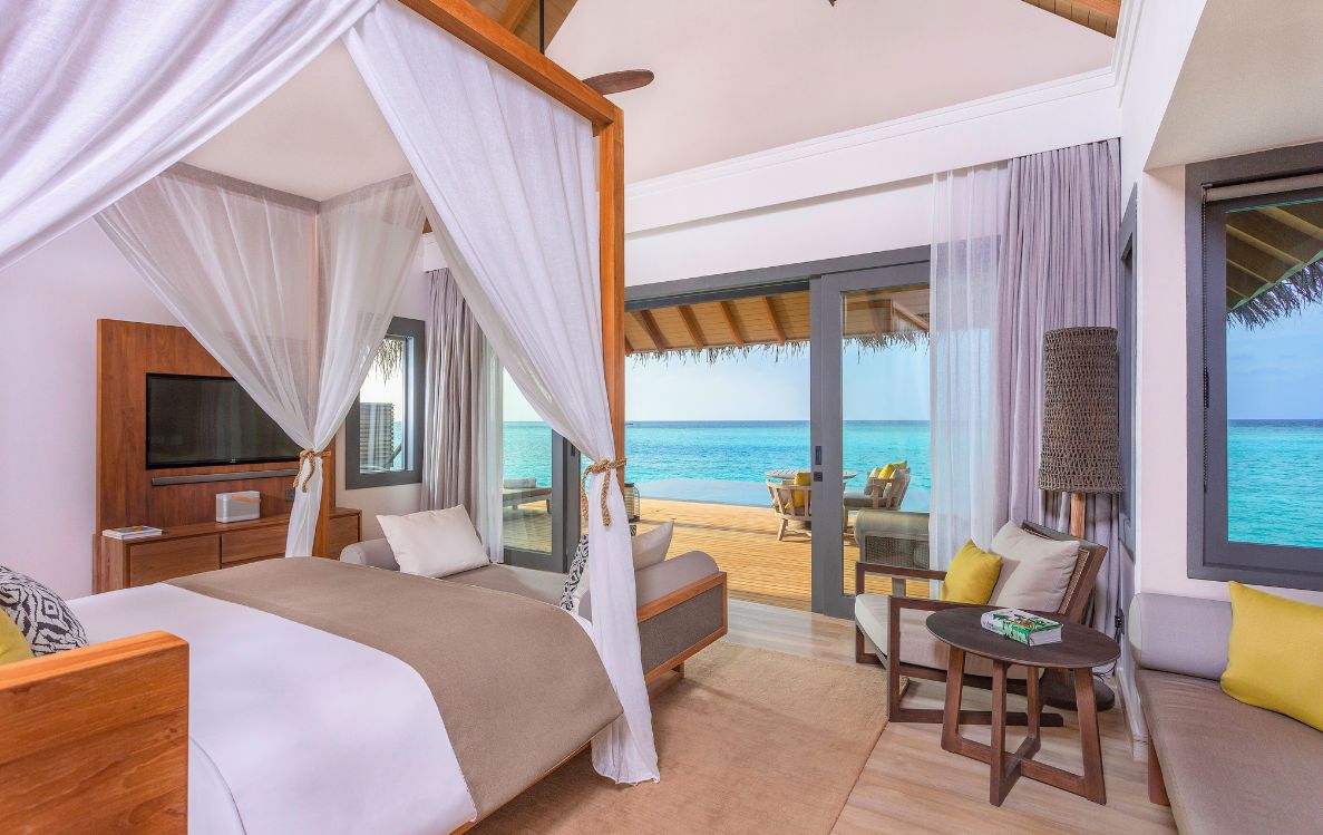 For families seeking adventure and indulgence, BOLIFUSHI’s two-bedroom Ocean Pool RESERVE Sunset with Slide is a showstopper. This lavish villa accommodates four guests and features a master bedroom, a convertible second bedroom, and a private infinity pool. The highlight for kids (and adults) is the 23-metre water slide that plunges straight into the turquoise lagoon. While children play, parents can unwind with a stocked wine fridge and a private bar setup included in the RESERVE™ plan. It’s the perfect combination of fun, luxury, and relaxation, ensuring every family member has the time of their life.