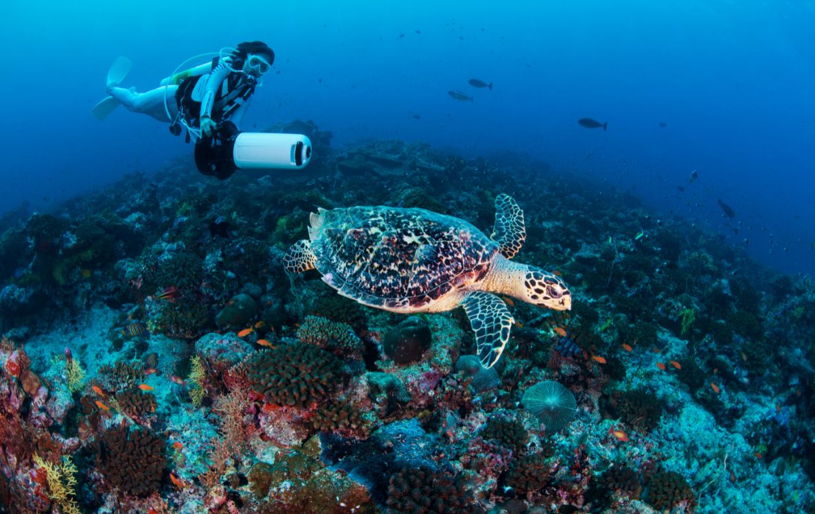 The ocean, in turn, tells its own story. Descending into a “thila”, you find yourself among soft corals and schools of anthias. Rays glide past effortlessly, reef sharks patrol distant plateaus, and the gentle current invites calm, measured breathing. Each movement underwater feels meditative, an intimate dialogue with a world larger than ourselves.