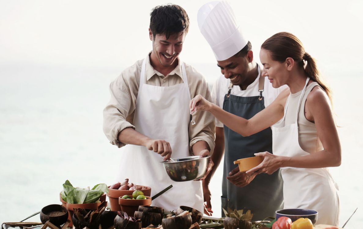 For dinner, Guduguda offers a distinctly Maldivian experience. The restaurant centres on traditional, seafood-driven dishes built around coconut milk curries, spiced rice, regional fruits and vegetables, and homemade bread. Dining is done low to the floor on cushions, indoors or on a patio overlooking the water, encouraging conversation, sharing and a slower pace that mirrors the name’s meaning of relaxed togetherness.