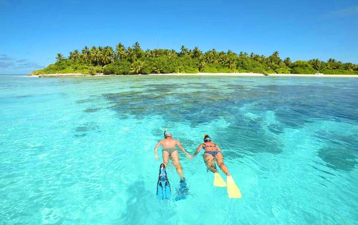 The island is well placed near the atoll border with named sites on both sides. Beginners can look for reef manta rays at Manta Point; more experienced pairs can choose Shark Point for schooling eagle rays, tuna and silver jacks; Blue Canyon for soft corals; or Madi Gaa for its broad marine life. Plan an early start for calmer water and fewer boats.