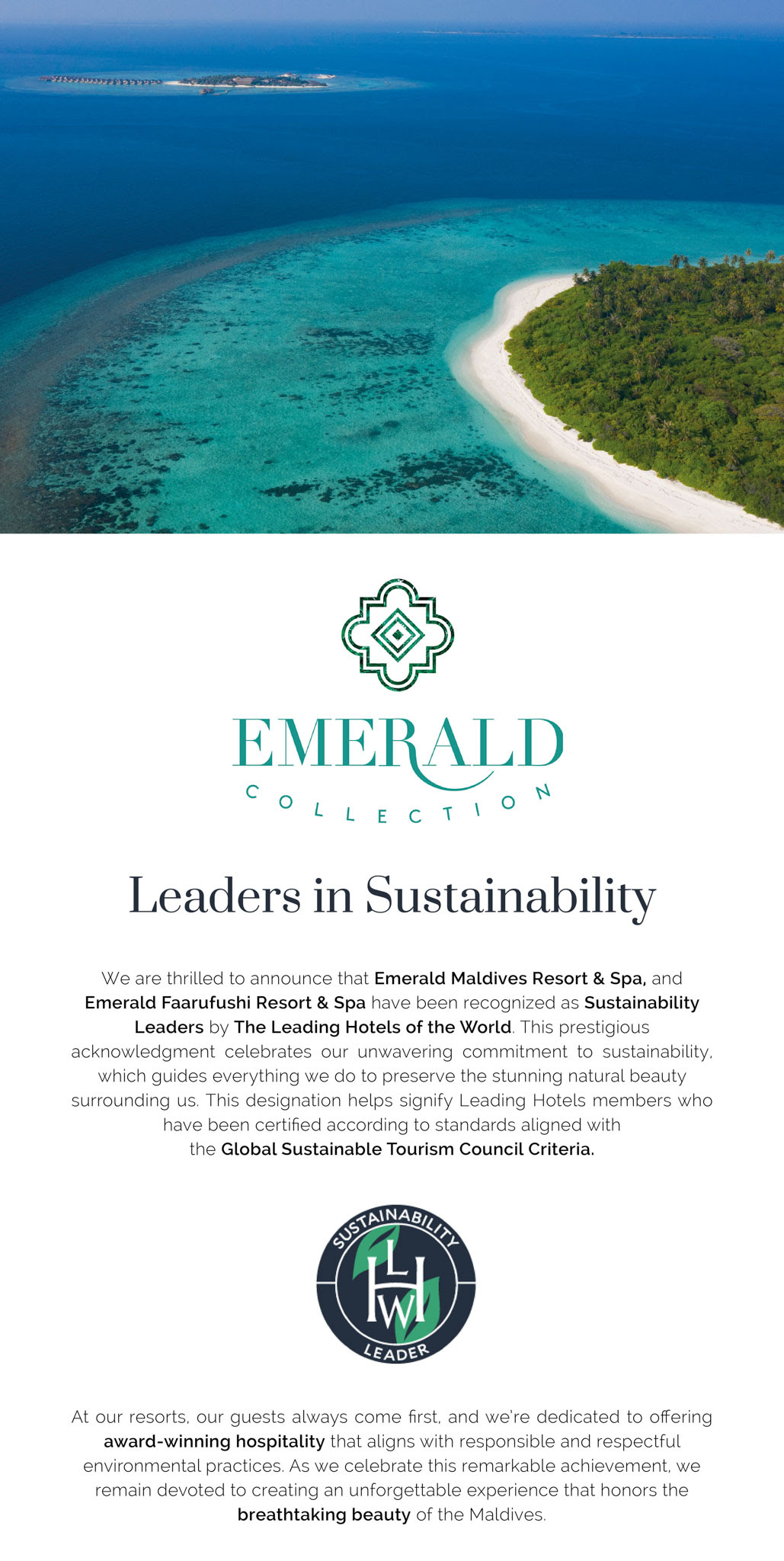 Emerald Faarufushi Resort & Spa has been recognised as a Sustainability Leader by The Leading Hotels of the World, an achievement that reflects their dedication to sustainable practices.