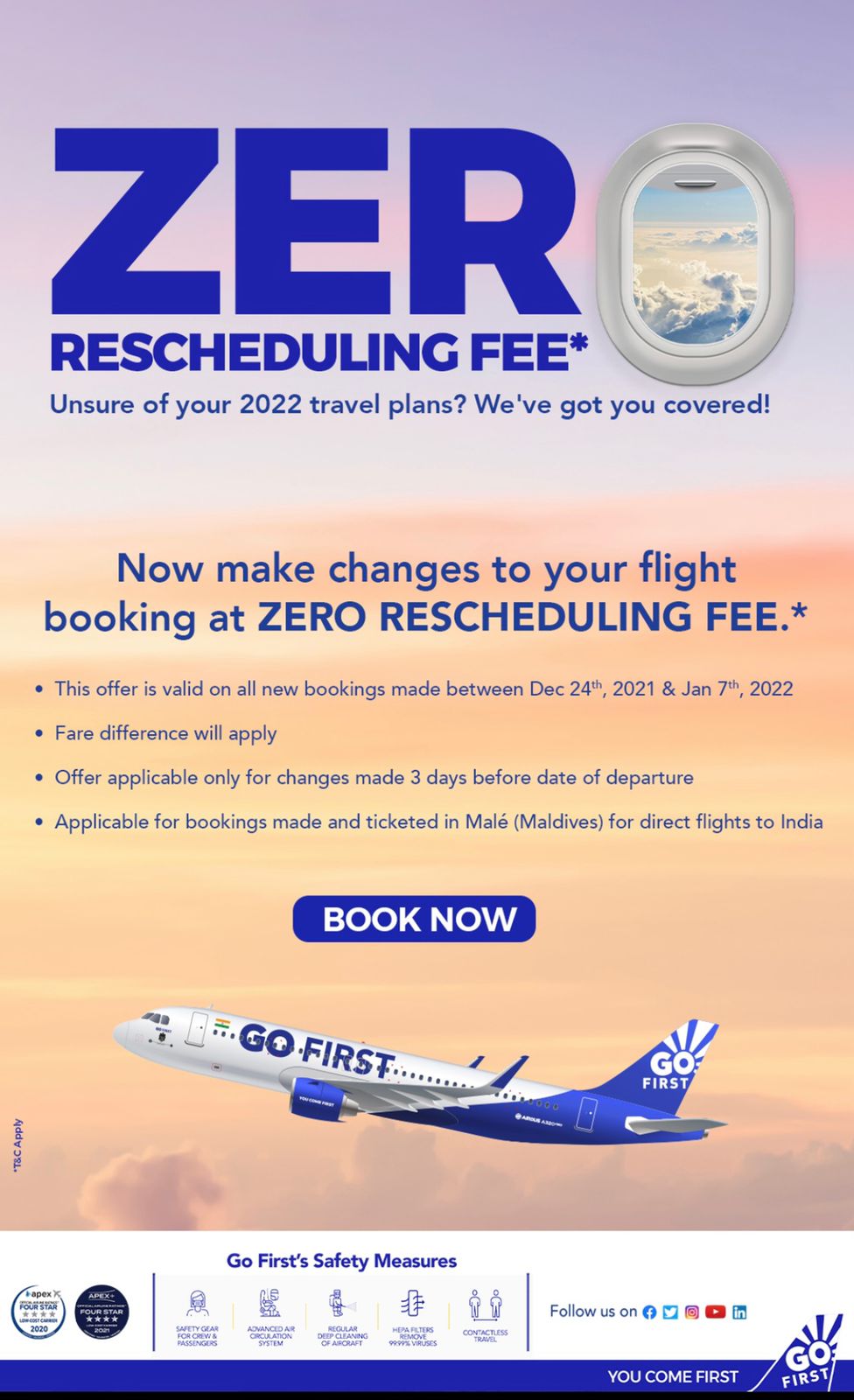 Go First Airline is offering zero rescheduling fee for all the bookings made between 24th December and 7th January 2022. This will be applicable for bookings made and ticketed in Male’ (Maldives) for direct flights to India.