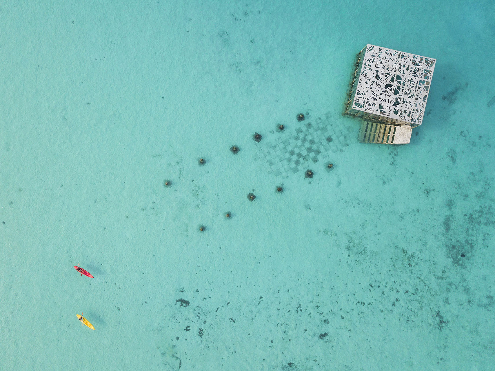 The Coralarium is the Maldives’ first and only coral regeneration project in the form of an underwater art installation, conceptualised by British eco-artist, Jason deCaires Taylor. The Coralarium structure acts as an artificial reef, encouraging marine life to make it a home. Each one of the soaring sculptures, designed to imitate the formation of coral, is constructed of more than 500 ceramic ‘starfish’ – the hard shells catch biomass, or ‘fish food’, which encourages coral larvae to attach and thrive, while cubbyholes in the structure allow small fish and crustaceans to make them permanent homes as they provide perfect the perfect refuge from predators.