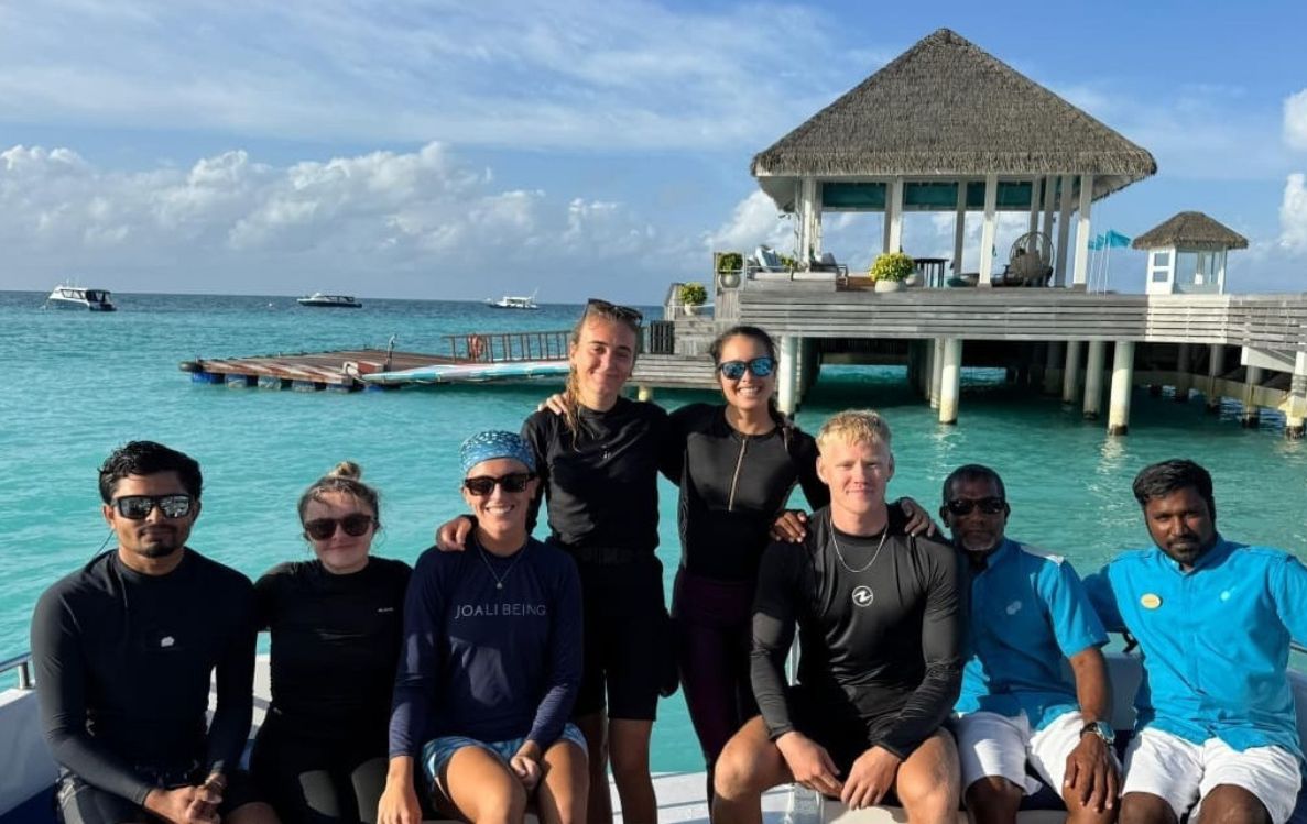 The event was distinguished by its spirit of collaboration, with four marine biologists from neighboring resorts—including Joali Being, Westin, Coco Palm, and Dusit Thani — joining the effort. The visiting experts, Philippa Darby-shire Jenkins from Joali Being, Rosalie Bailie from Coco Palm, Harry Longin from Westin, and Louna Marchand from Dusit Thani, participated in hands-on coral transplantation dives, equipment preparation, and reef health activities, including the removal of invasive pincushion sea stars.