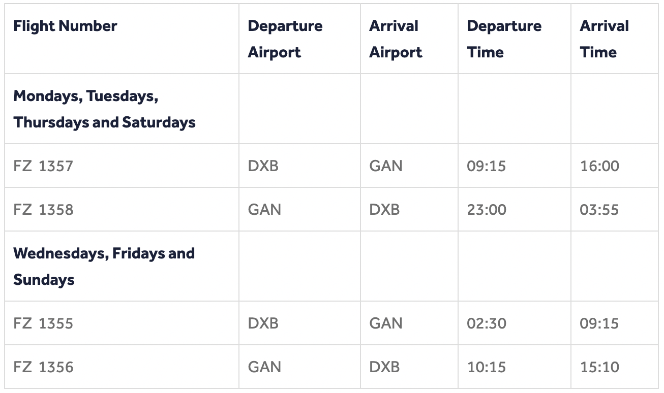 Return Business Class fares from DXB to GAN start from AED 7,400 and Economy Class fares start from AED 4,050. Return Business Class fares from GAN to DXB start from USD 1,600 and Economy Class fares start from USD 550.