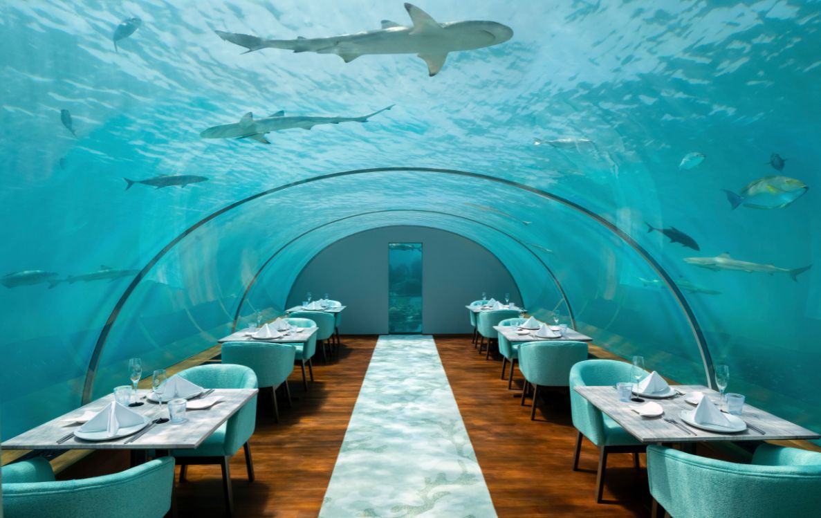 Since its opening in 2005, Ithaa has reigned supreme as the world’s first undersea restaurant. Placed five metres below the Indian Ocean, it offers panoramic coral-garden views through its glass dome. Seating just 14 guests per sitting, the intimate fusion tasting menu is artfully matched with fine wines—truly a once-in‑a‑lifetime dining experience.