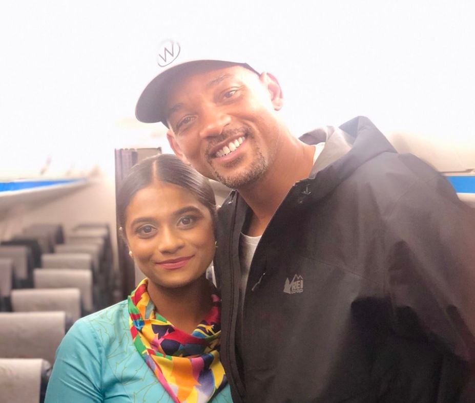 A picture of Will Smith upon his arrival to the Maldives with a Maldivian Cabin Crew