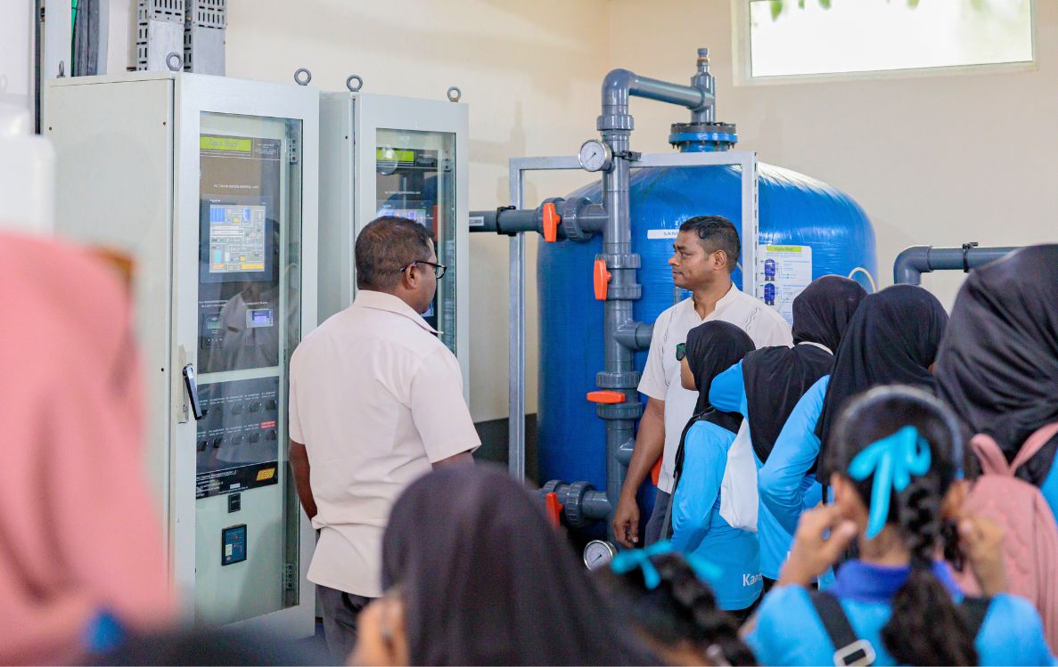 After the presentation, the EPA team, students, and Kuda Villingili team travelled to the resort for an immersive experience. Following a delightful refreshment at Spice Restaurant, the students embarked on a guided tour of the resort’s guest accommodations, facilities, and engineering area, where they witnessed firsthand the innovative sustainability measures in place.