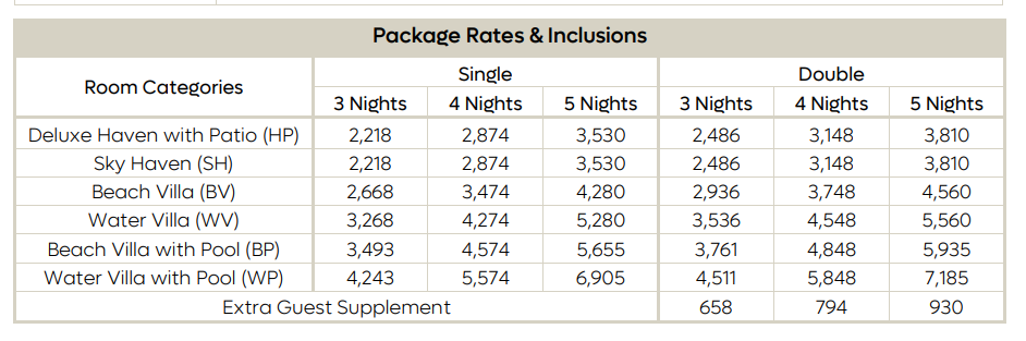 For a short getaway, the four-night package is ideal, with prices starting from 2874 USD for a Sky Haven room or the five-night package for 3810 USD for double rooms. Check out all the package rates and inclusions down below.