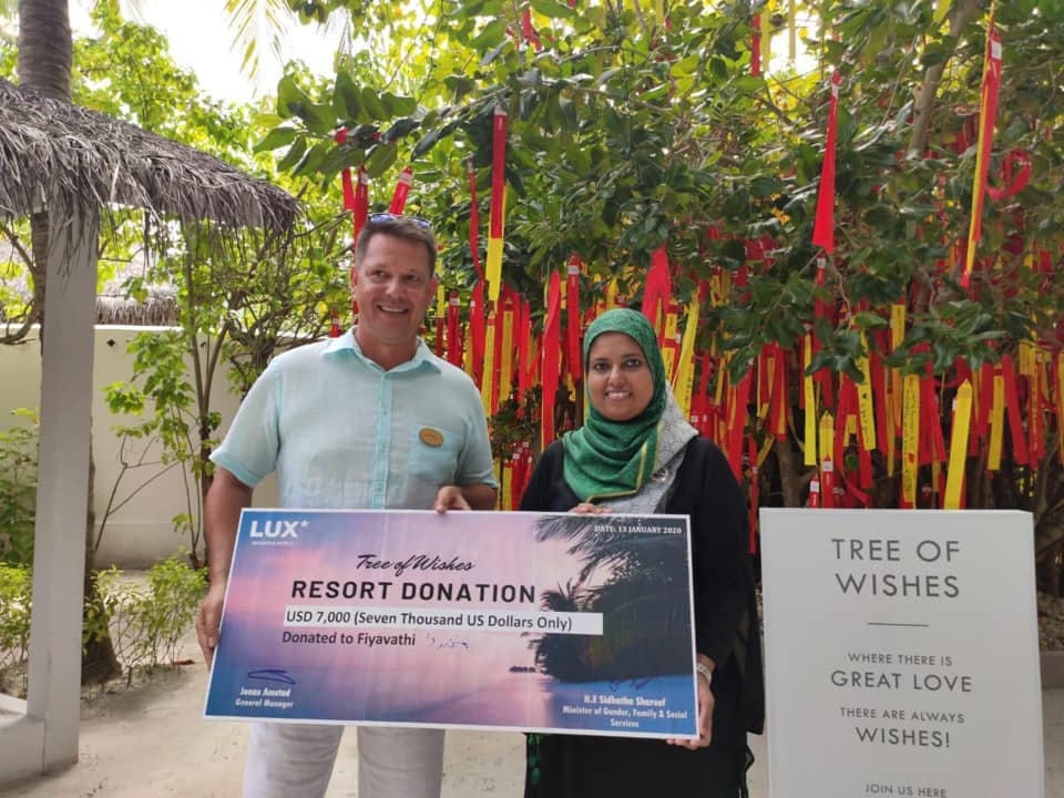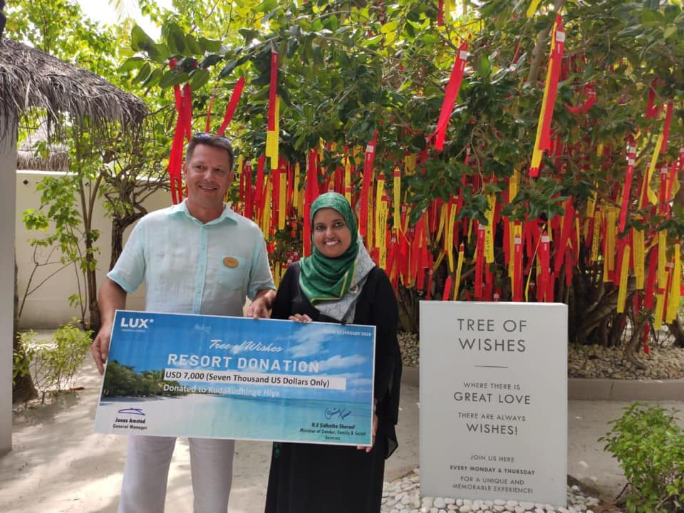 During a ceremony held at the resort Jonas Amstad, the General Manager at LUX* South Ari Atol handed over the donations to the Minister of Gender and Social Services, Shidhatha Shareef.