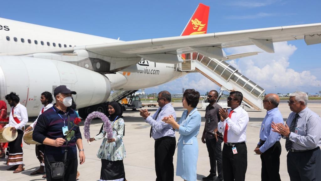 The arriving tourists were greeted with traditional boduberu, and a special gift pack along with flowers in celebration of welcoming the first visitors from China to the Maldives in the past 3 years. The event was joined by a high-level delegation, including Ministers, Ambassadors and other high-level executives from the Government of the Maldives and China.