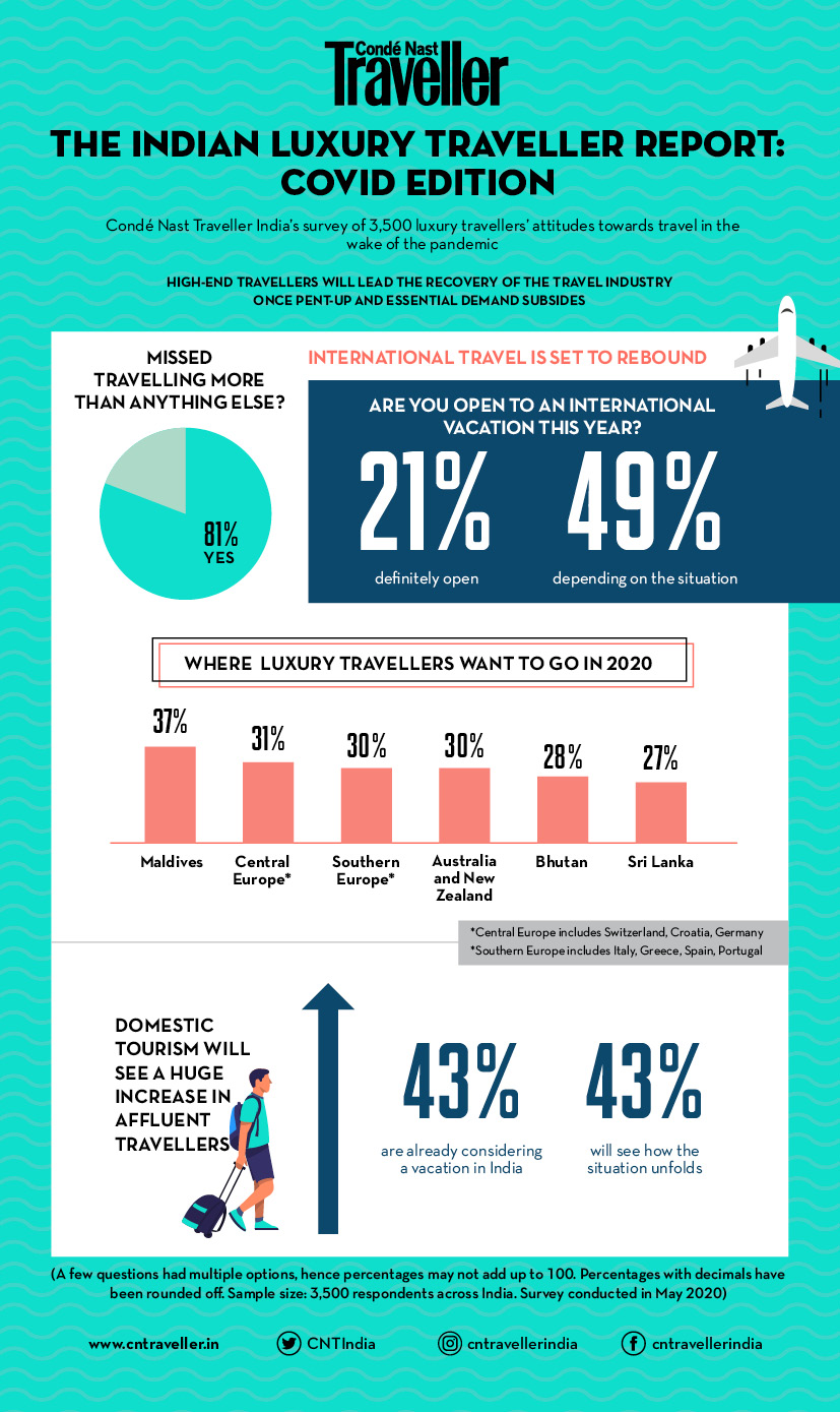 The report is an outcome of an online survey of 3,500 Indian luxury travelers, conducted in May 2020. More than 70% of the respondents polled were from the big metros of India: Delhi-NCR, Mumbai, Pune, Bengaluru, Chennai, Hyderabad, Kolkata, Ahmedabad. Seventy-three percent were in the 25-55 age bracket; 45% were salaried employees, 24% were self-employed/consultants, while 14% were entrepreneurs and 3% were retired.