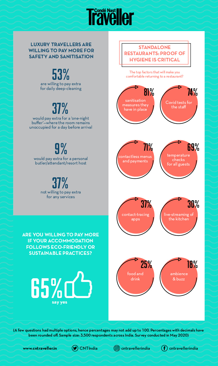 The survey further revealed that the Indian luxury traveler assumes that airlines, hotels and restaurants will have systems for hygiene and safety in place, but they want to see them being followed for themselves. Trust will be key. While flying, for instance, COVID-prevention measures will be the #1 factor while picking an airline. And at hotels, it will be imperative that guests are able to witness some of the cleaning process, are assured of the cleaning products being used, and that all staff are trained so that they can answer any questions or concerns guests bring to them.