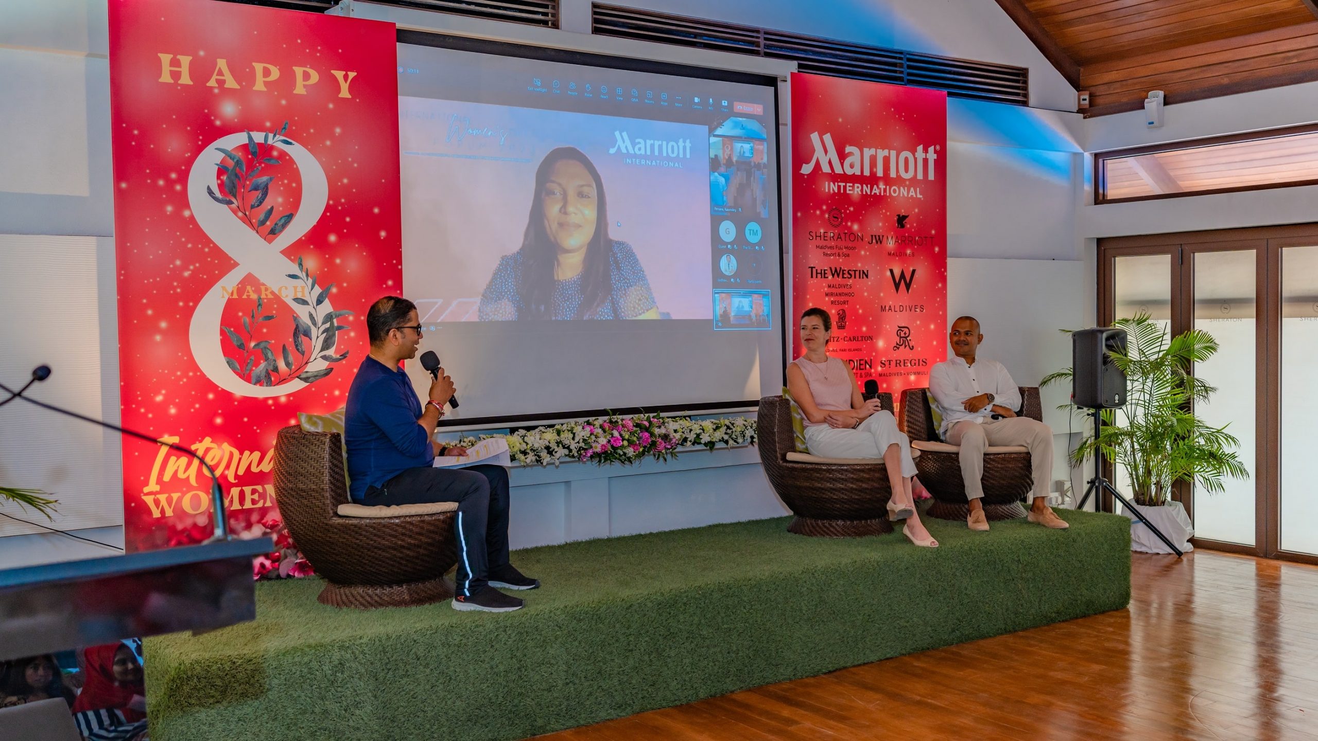 The first event was a panel discussion held at Sheraton Maldives Full Moon Resort & Spa, featuring Ms. Emma Jones, Area Director of Human Resources Marriott International for Singapore, Malaysia, and Maldives; Ms. Shalinee Ahmed, Market Director of Sales & Marketing Marriott International for Maldives; and Mr. Mohamed Shiman, Director of Human Resources at Sheraton Maldives Full Moon Resort & Spa. The discussion focused on the topic of “Women’s achievements and progress towards equality”. The event was broadcast live, allowing female associates from all seven Marriott Bonvoy resorts in the Maldives to participate virtually, while few female talents from each of the resorts were also physically present at the event.