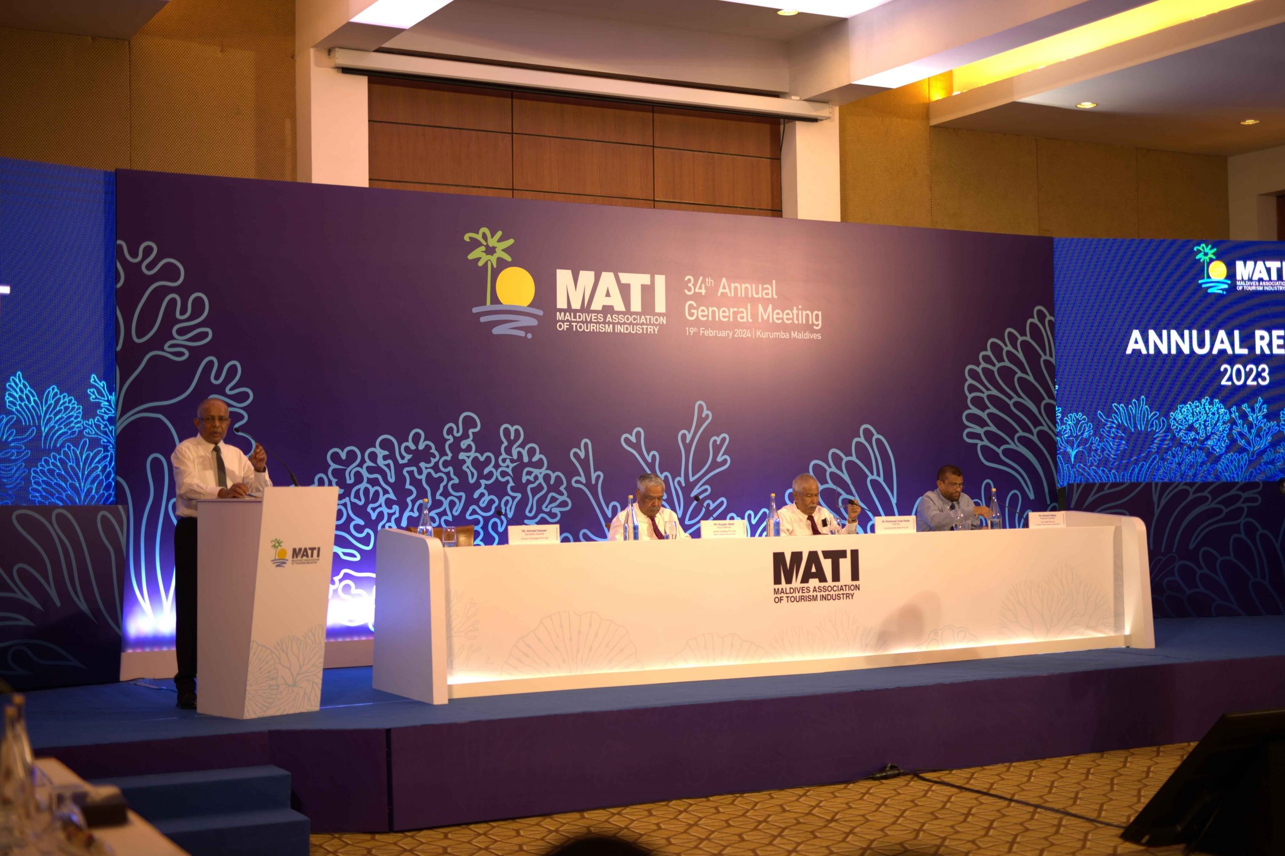The Maldives Association of Tourism Industry (MATI) held its 34th Annual General Meeting at Kurumba Maldives yesterday, with A total of 100 members in attendance. The day’s events began with a welcome address from the Chairman of MATI, Mr Mohamed Umar, who also presided over the session. The agenda included an address from the Secretary-General, Mr Ahmed Nazeer, the review and approval of the minutes of the 33rd AGM, the review and adoption of the Annual Report and Financial Reports for 2023, the approval of the 2024 budget, the appointment of auditors for 2024, the welcoming of new members and election of executive board members to the two vacant positions (by-election).