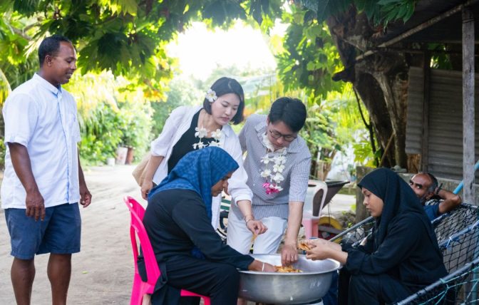 The tour is led by Ali “CR” Niushad, a proud member of the Milaidhoo team and a native of Kihadhoo. With CR as guide and storyteller, guests experience the island not as outsiders but as welcomed friends. The journey begins with a warm welcome by local flower girls dressed in traditional Maldivian attire, setting the tone for what is not a tour but an invitation into island life.