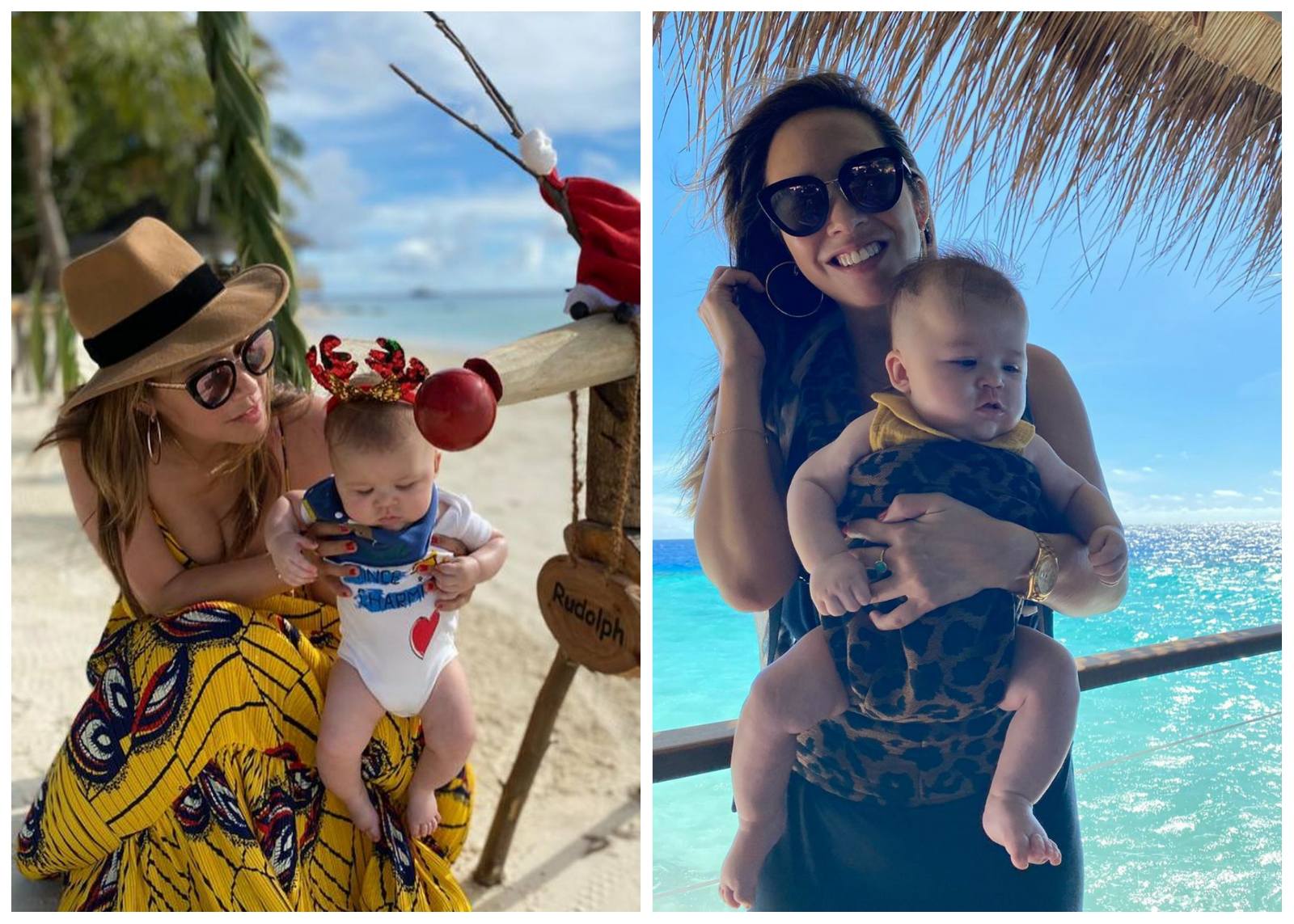 Klass posted pictures to her Instagram account of her family, baby son Apollo (4 months) and daughters Ava (12) and Hero (8), and her partner Simon, all relaxing while wearing Christmas hats on Konotta’s idyllic tropical palm beach.