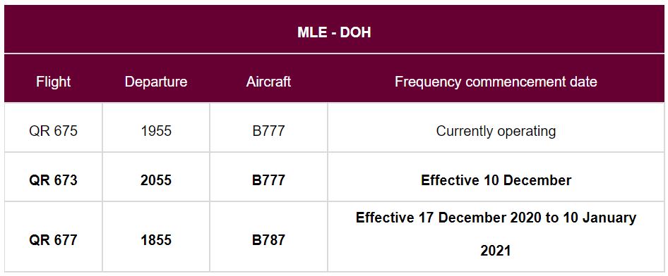Qatar Airways is increasing the frequency of daily flights from Doha to Maldives starting from 10th December 2020. From today onwards, Qatar Airways will operate 2 daily flights to Maldives and another will be added on the 17th of December 2020.