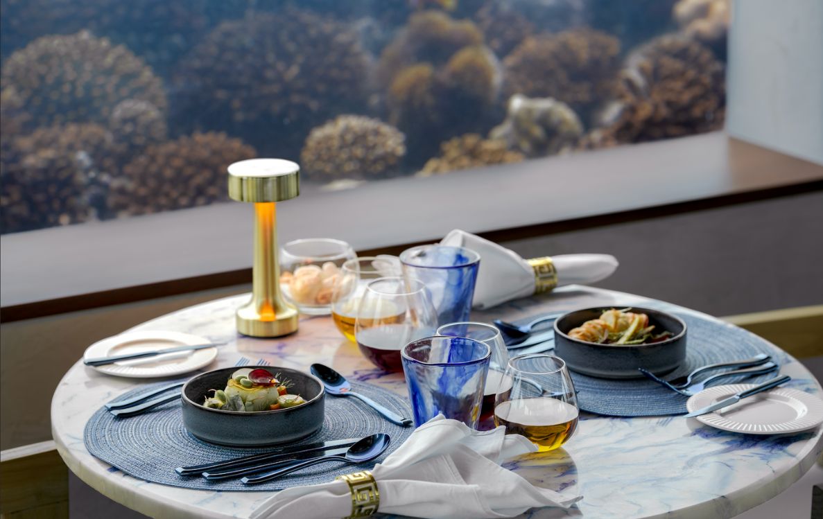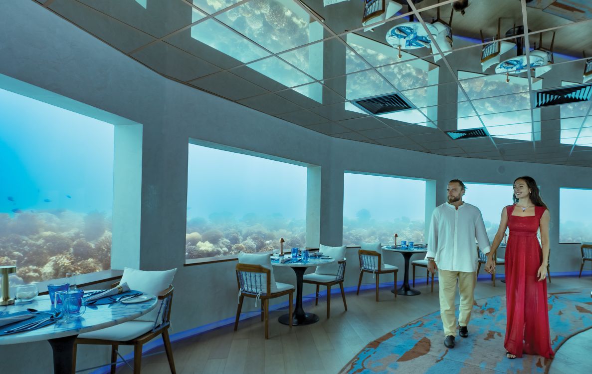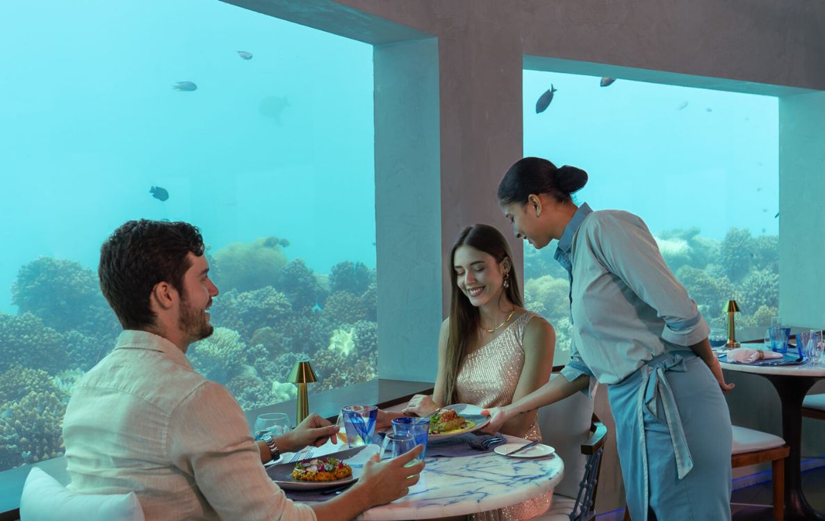 Only BLU is a feast for all the senses. Beyond the stunning ocean views, the restaurant’s menu is a celebration of modern gourmet cuisine. Each meal is carefully crafted, with options for meat lovers, seafood enthusiasts, and plant-based diets, along with a special menu for younger guests. The curated dining experience is available for both lunch and dinner, with each dish designed to complement the mesmerizing underwater setting. Guests can watch schools of fish swimming past or witness the occasional shark glide by, adding an exciting touch to their meal. With its exceptional setting and exquisite service, Only BLU is a popular choice for romantic dinners and special celebrations, including marriage proposals, making every moment feel even more magical.